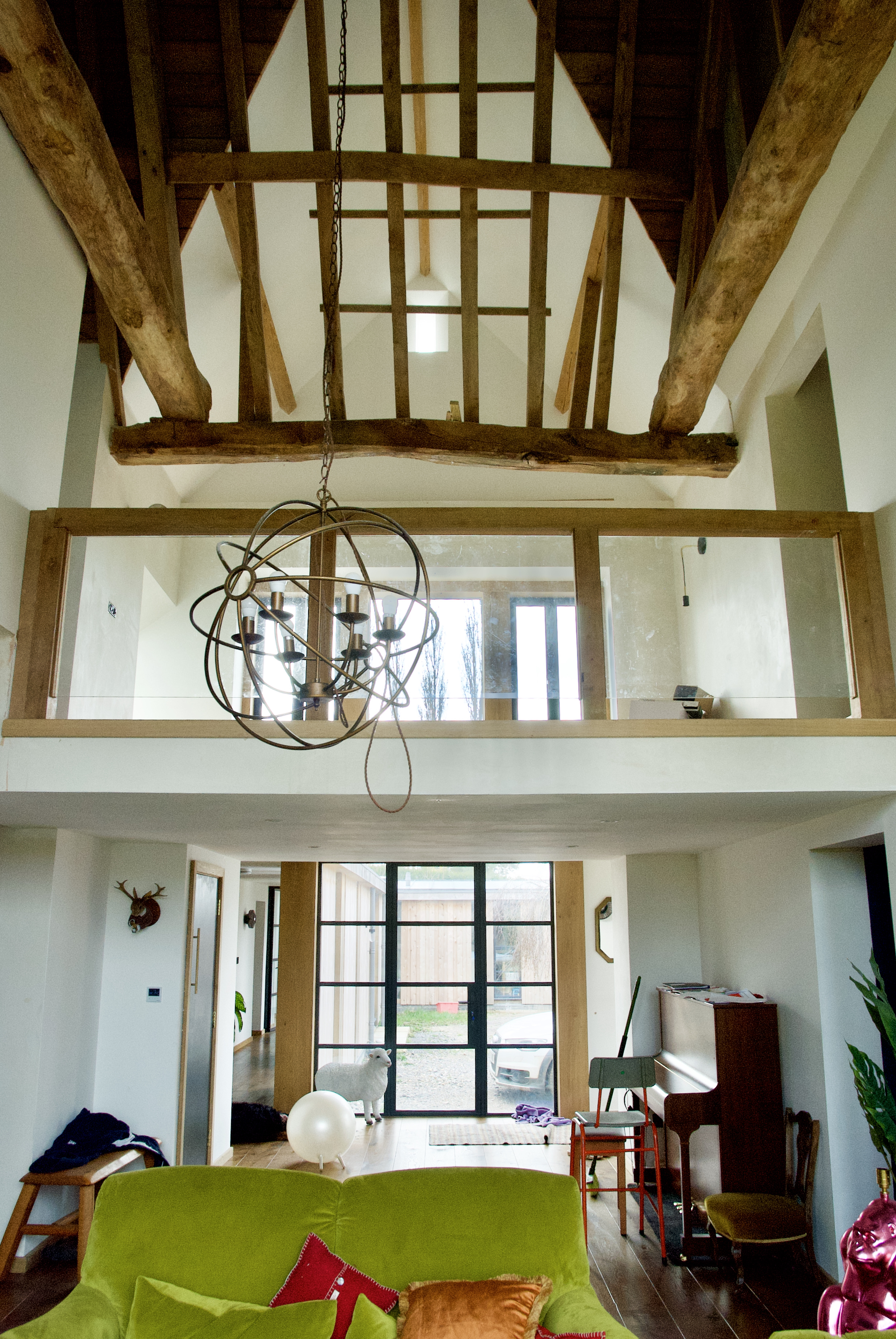 lofty barn space with old wood beams inviting green sofa wood strip floor dark grey framed glass screen looking out onto courtyard with well tended lawn