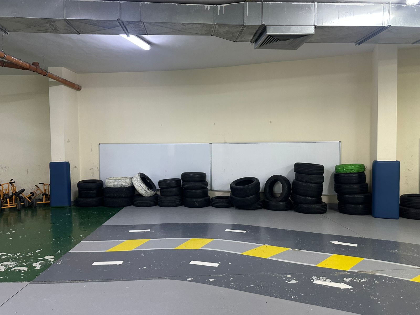 in this area i want to add 3 houses for kjids to play each themed as fire station and police station and kids shop remoce the wheels in the picture and add these three themed playhouses with colors that fits each the me and sizes for kids to enter and play inside add between the houses fake grass with small decorations and add kids so the picture will look real