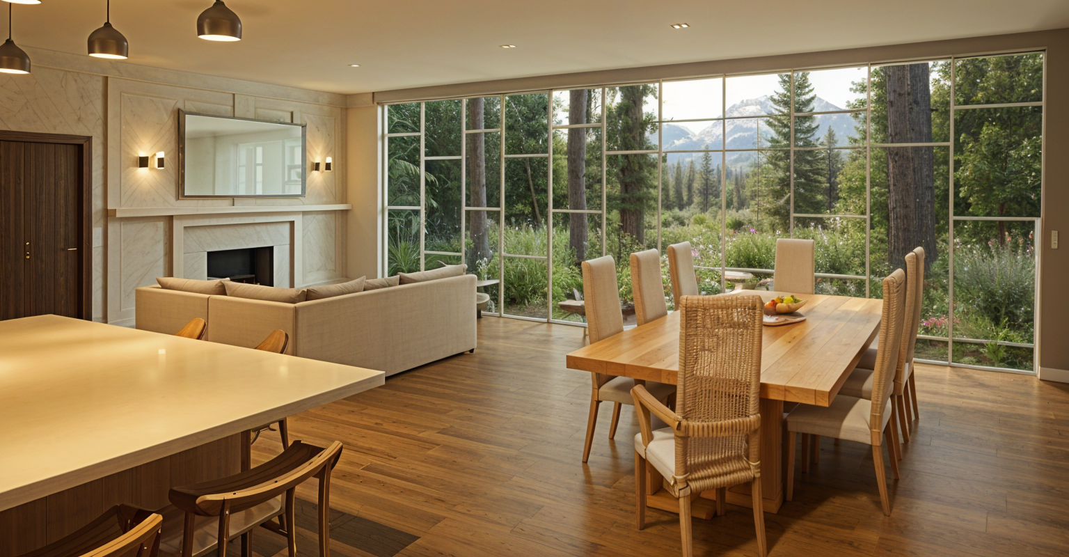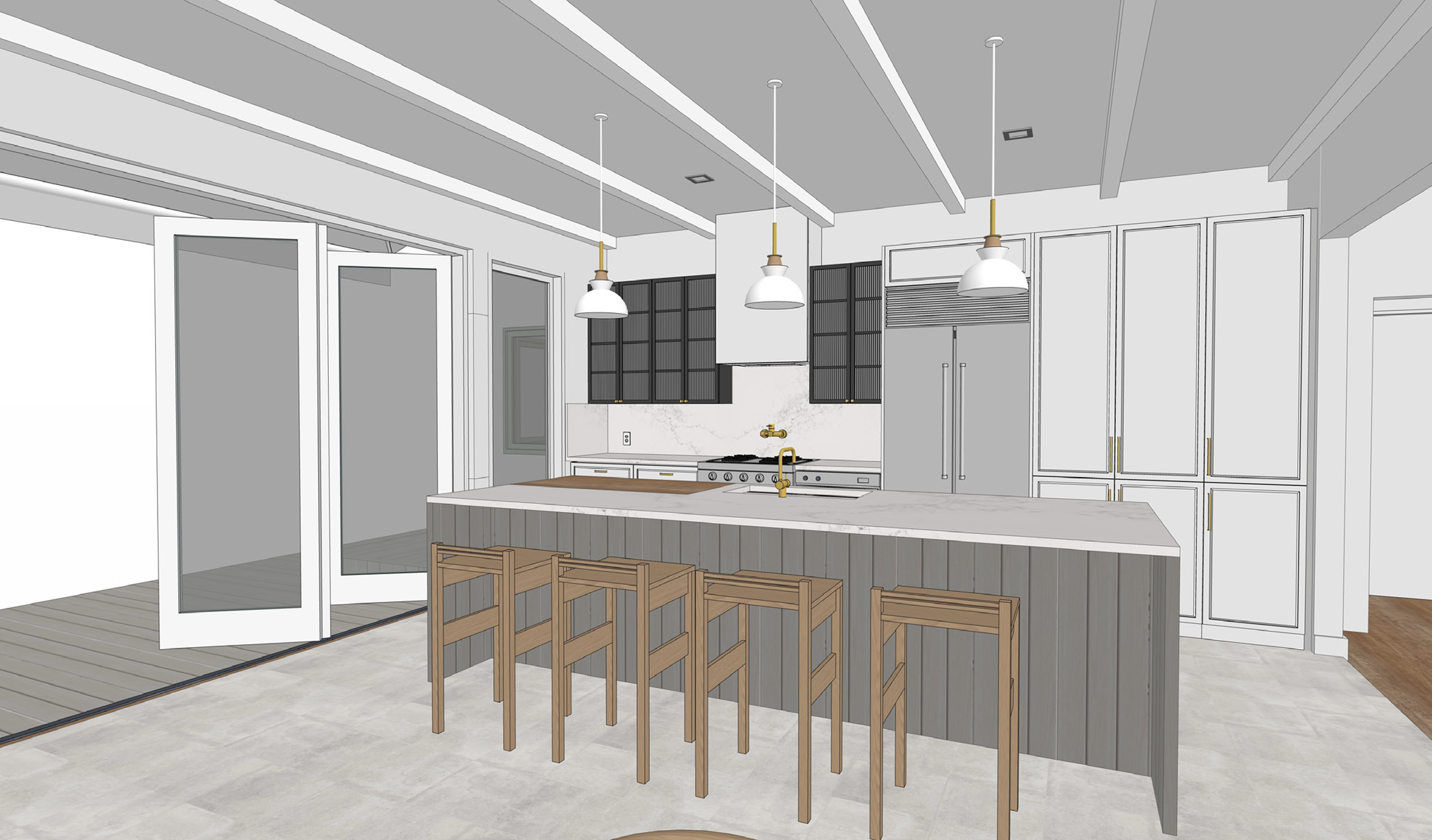 interior design of a luxurious modern kitchen featuring an elegant marble countertop on a gray island with shiplap texture the cabinets are a soft white complemented by brushed brass handles the range is stainless steel add pendant lights with warm gold accents hanging from the ceiling the floor is a gray stone large bifold doors allow natural light to flood the space creating a bright and welcoming atmosphere open to a deck and lush garden beyond black framed wall cabinets have reeded glass fronts wooden bar stools