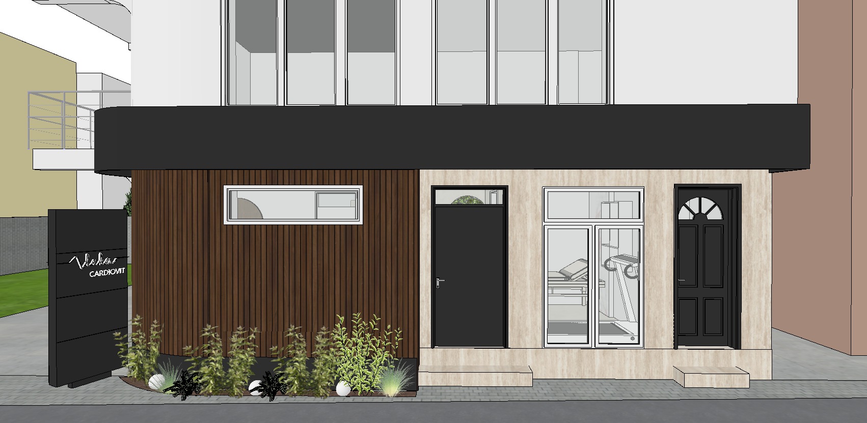this is a residential building which is used as a cardiology office on the ground floor the ambient light should not be warm but more illuminated with natural light and the ground floor facade should be distinguished from the upper floors the wood textures and the facade cladding on the right side with travertine should look as real and high quality as possible put real greenery while the white spheres are lights on the ground the logo should not change below the logo it should be written cardiovit both are with led lights do not change anything in the design of the facade or the order or anything else only the render should come out with high quality and as real as possible do not change the shape of the logo the ground floor windows should be blurred so that the interior inside is not visible the black part that separates the floor from the ground floor should not be written anything it should only be in anthracite so don t change anything just make the exterior render look as clean as possible with high quality and the textures look real