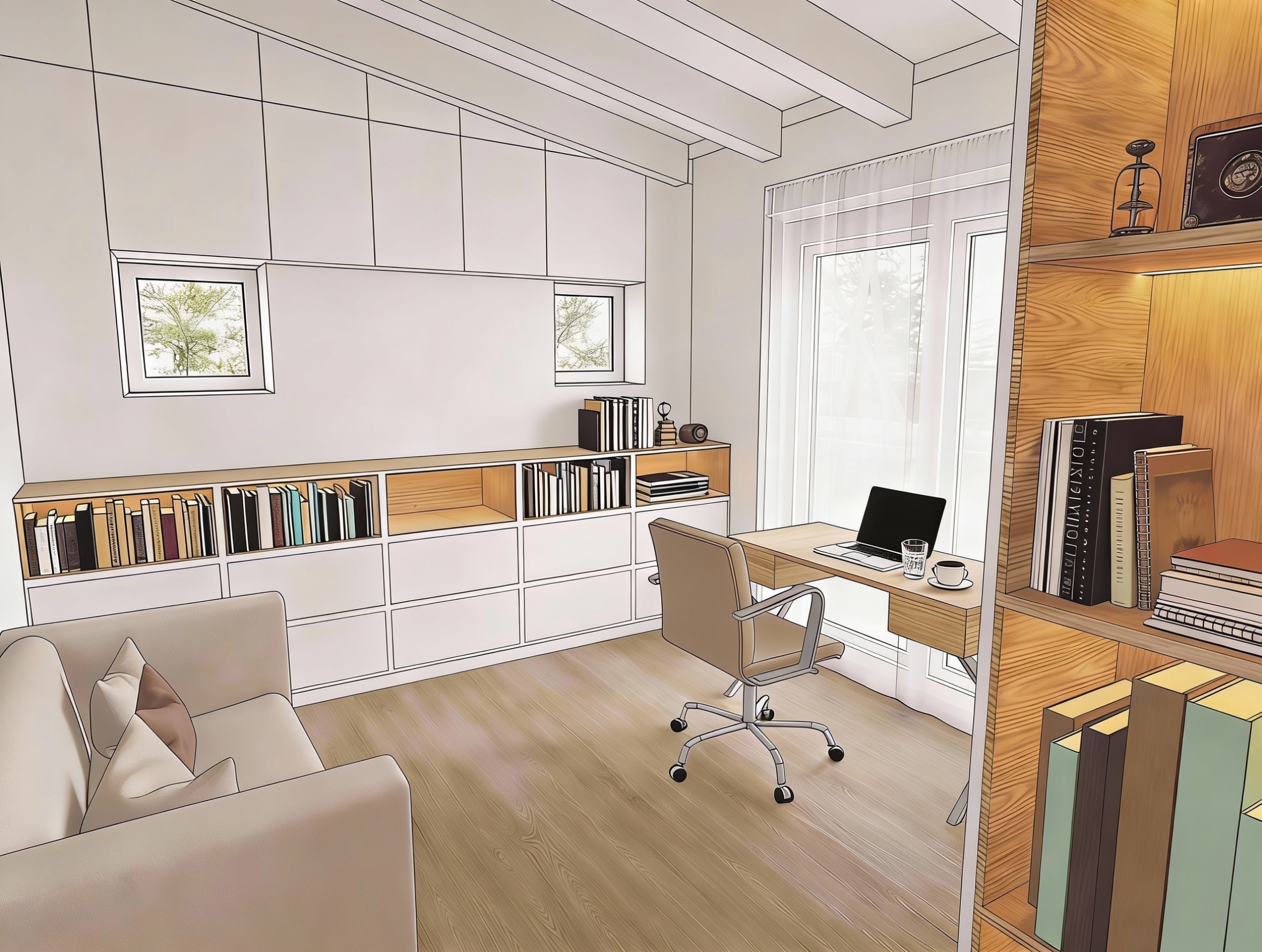 do not change anything walls are cream colour ceiling is white light wood on a floor through the window block of flats view the tiles on a floor and above the desk lighe grey