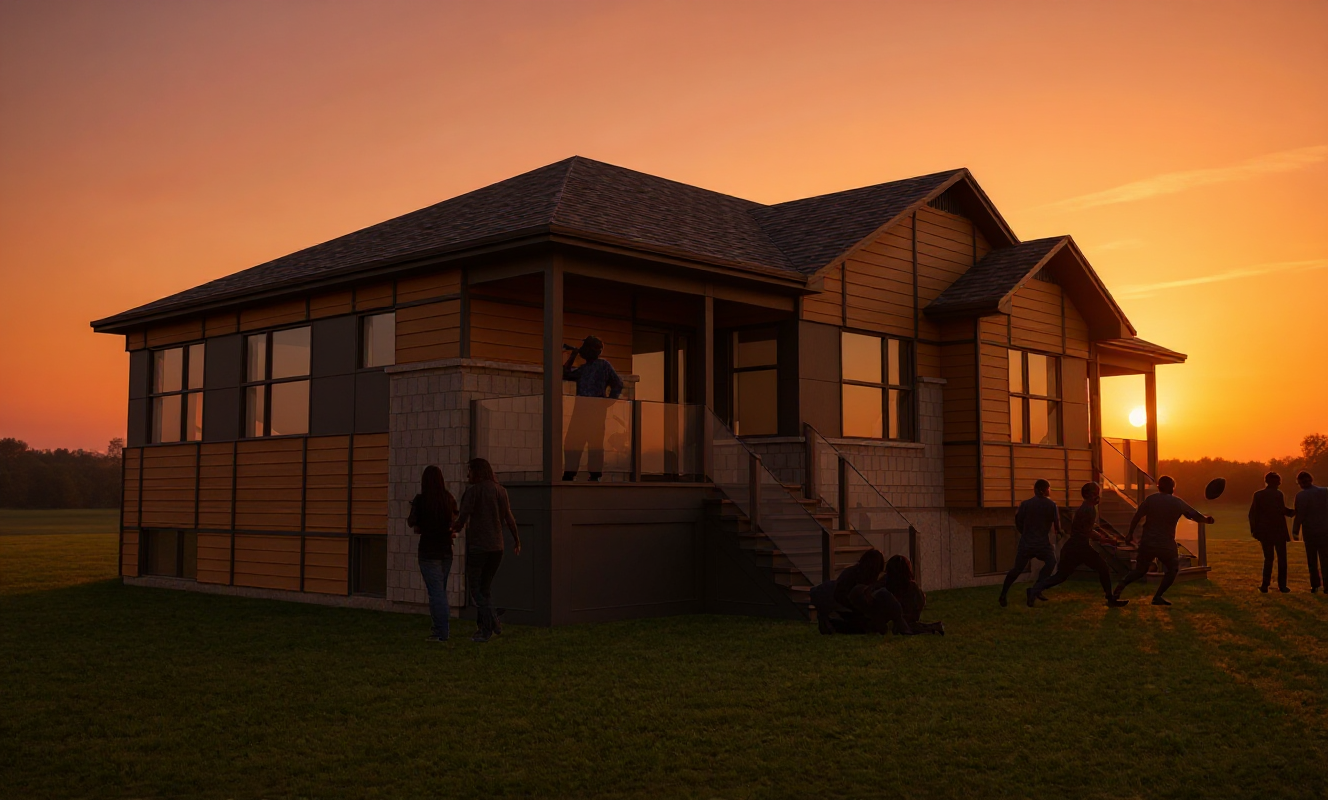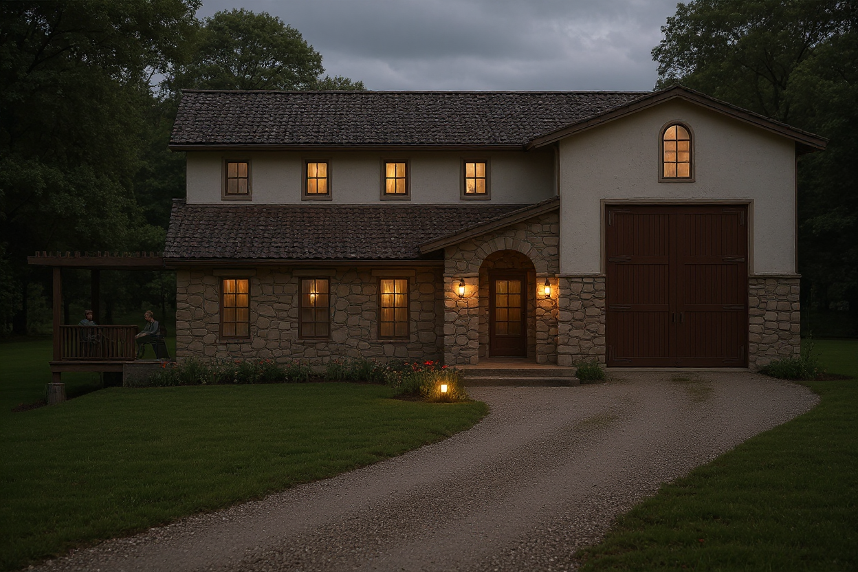 coastal setting brick stone stucco house with clay tile roof