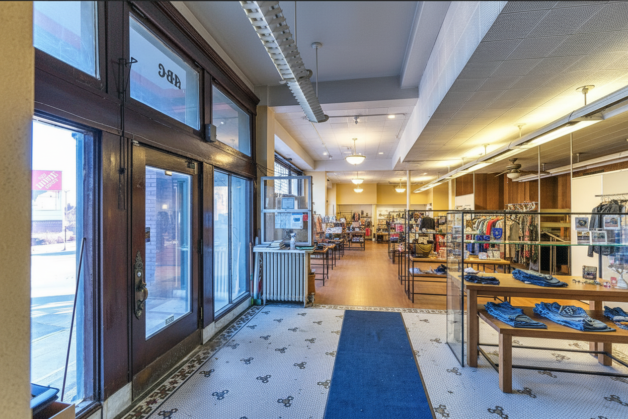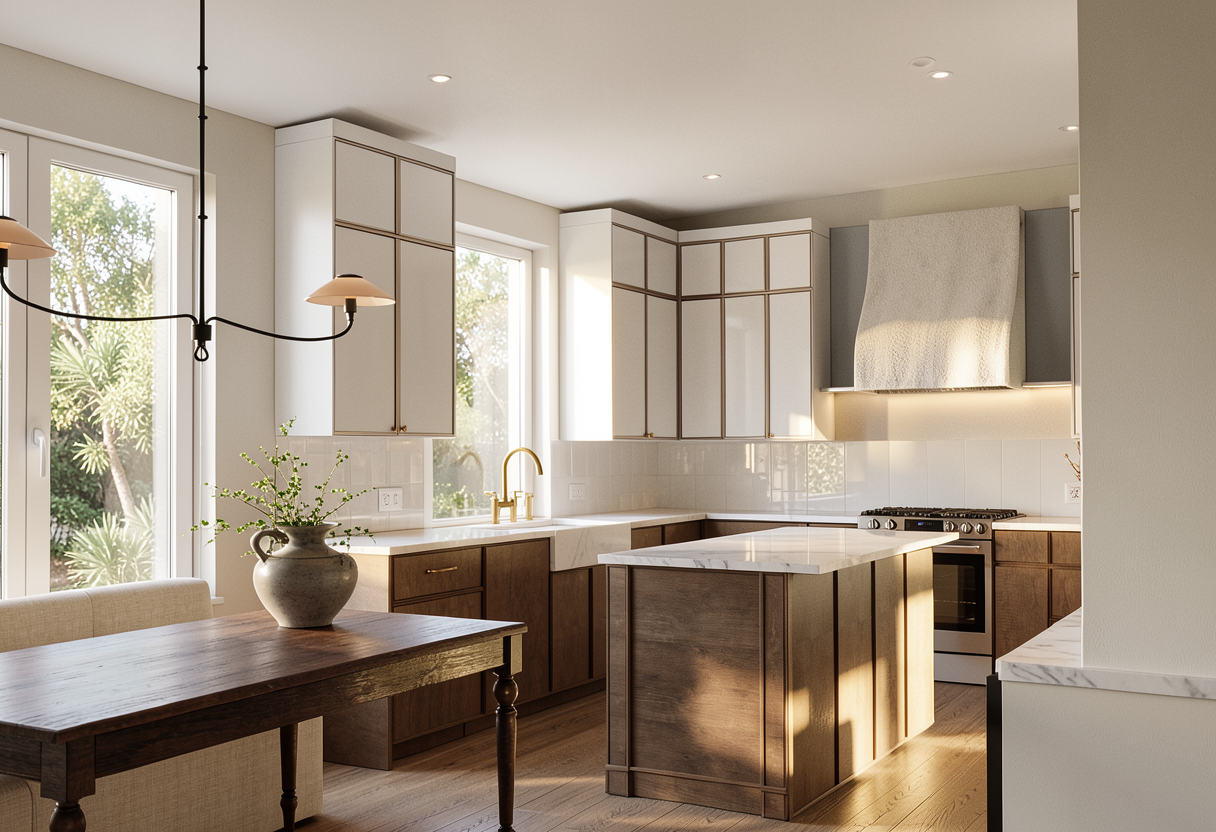 photoreastic image add old people to the space add family sitting at banquette on right side by the window show old person walking down the corridor on the left behind column natural lighting and soft shadows show an outdoor boucce court out of the window on the right side with outdoor patio area shown exterior parking lot with beach and ocean out the window on the right side