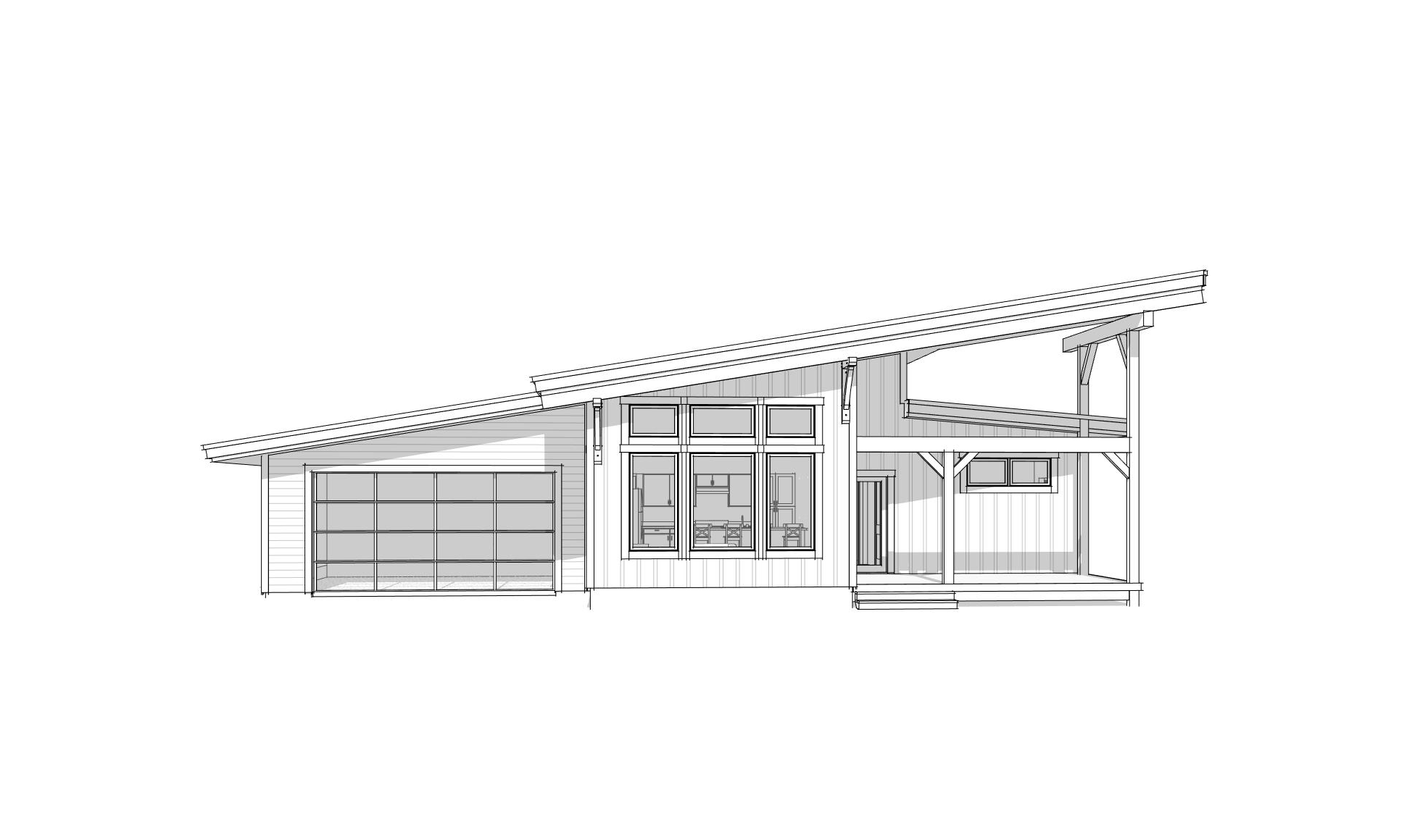 front view of a clean modern a frame cabin architectural exterior home rendered in cinematic vibrant morning lighting cabin in the forrest with streaks of light coming through the trees warm glow and reflections off of the windows blue sky shining through the trees make the trees thick and tall rustic select grade vertical warm wood cedar siding green manicured landscape around structure with gardens and patches of grass black standing seam metal roof prominent cinematic forest with big douglas fir trees and ferns and moss surrounding behind the house in the background high fidelity photorealistic visualization crisp shadow falloff refined facade geometry soft atmospheric depth premium architectural photography mood ultra clean composition and materials black trim around the windows flat roof photorealistic render concrete driveway leading to the garage door