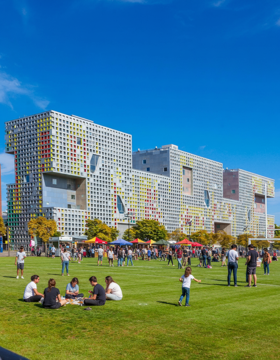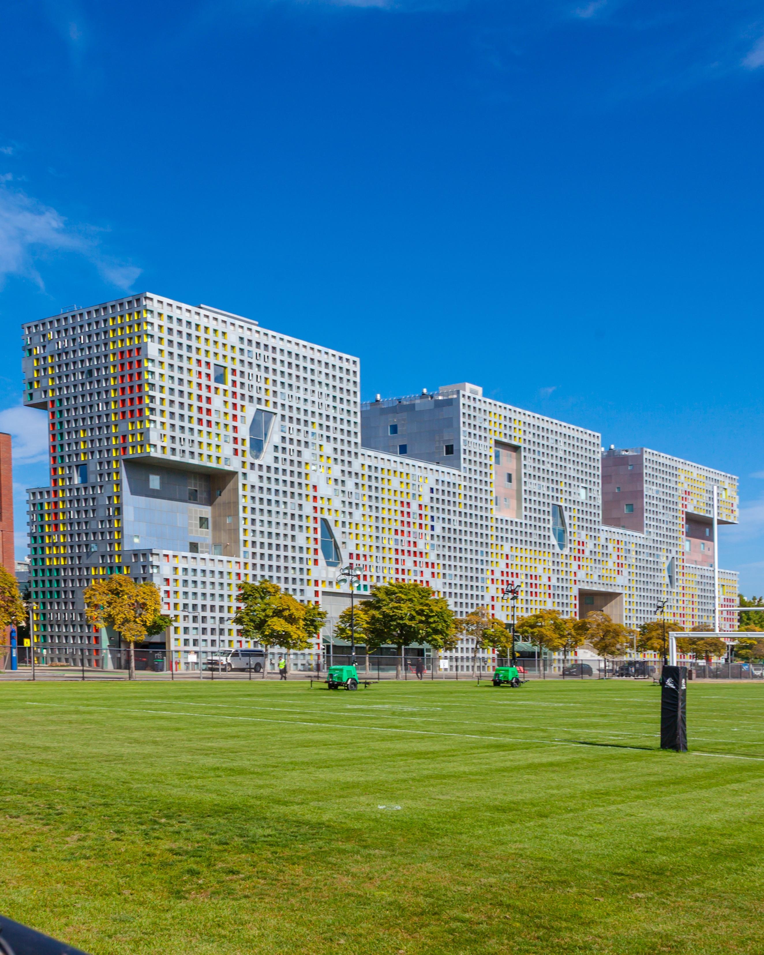 mid rise collective housing building organized around multiple courtyards fragmented massing rather than a single bar distributed voids throughout the building varied spatial conditions including open courtyards semi covered terraces and interior shared spaces porous facade with openings at multiple scales asymmetrical composition shifting floor plates and sectional variation inspired by steven holl simmons hall in spatial logic not form emphasis on light depth and spatial hierarchy realistic architectural rendering