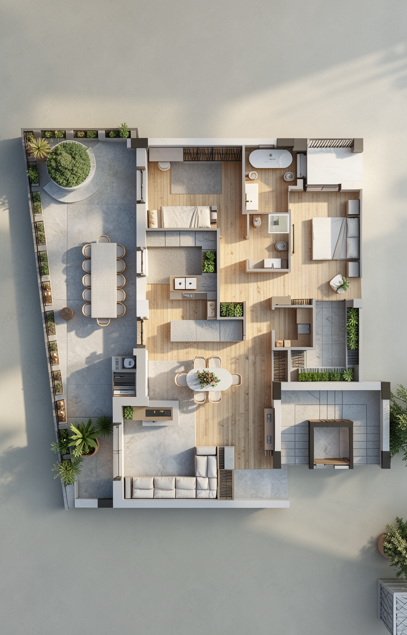 replace the back wall with a full width full height black aluminum glass wall in four equal sections replace the visible windows with matching black aluminum windows with muntin divisions apply warm clay plaster to the walls and ceiling and bologna microcement by solo gietvloeren to the floor keep the layout furniture proportions lighting direction and all other elements unchanged
