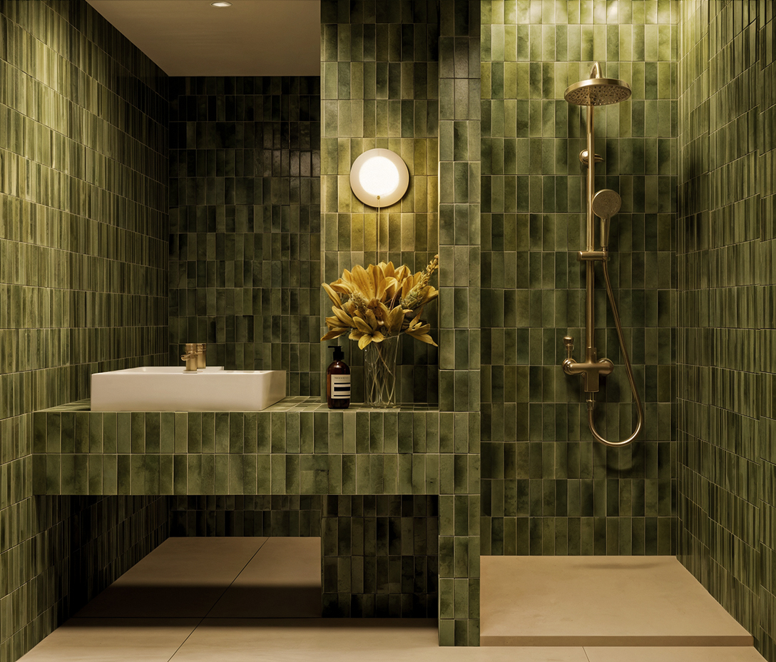 keep the image exactly as it is preserving all geometry materials lighting and composition add a clear glass shower screen at the entrance of the shower area with slim brushed gold framing the glass must be perfectly transparent with subtle reflections clean edges and accurate thickness aligned precisely with the floor and wall the gold frame should be minimal elegant and consistent with the existing fixtures do not alter any other element of the image