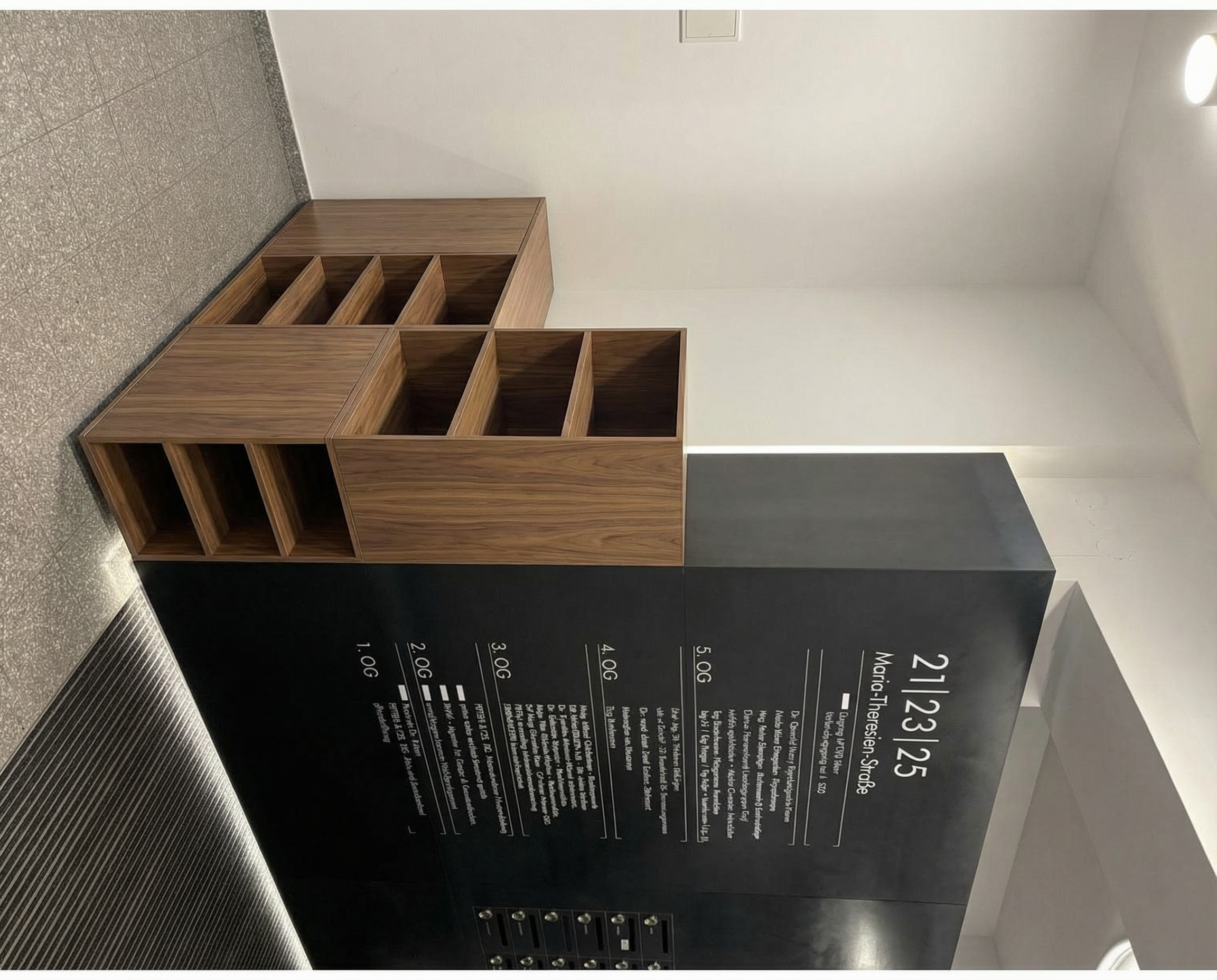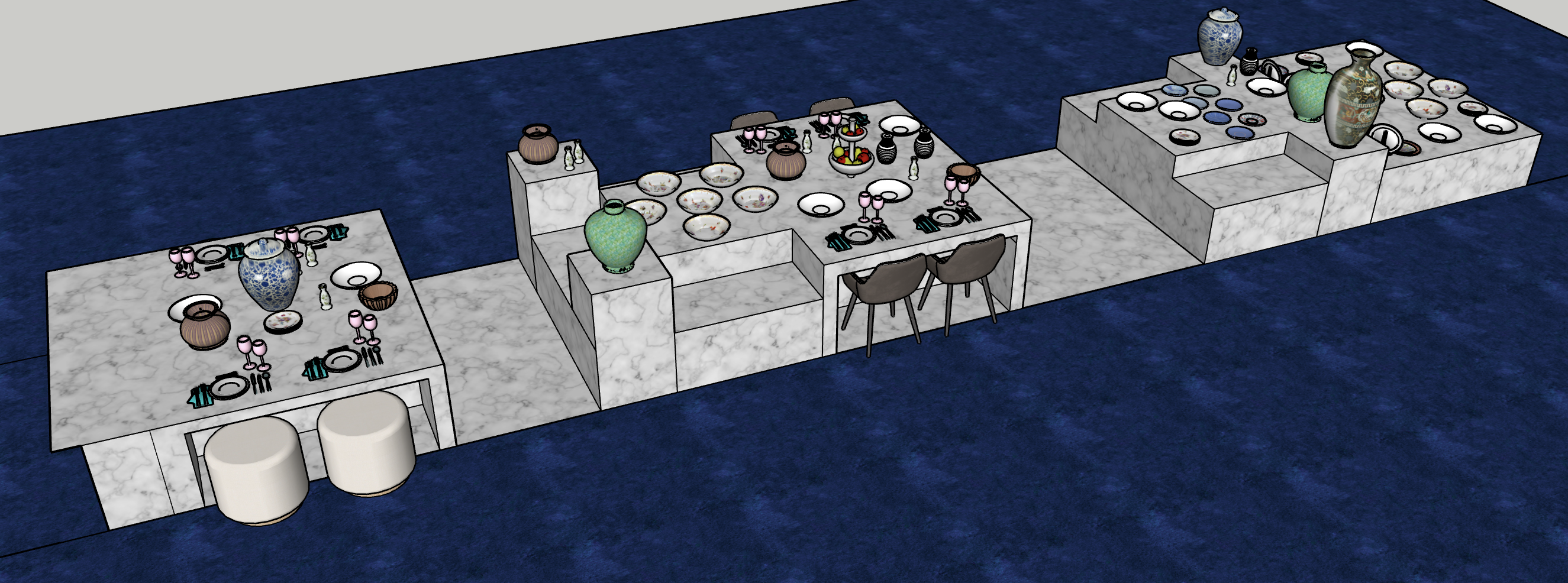 three marble tables with ceramics displayed on them they have different components for display and seating purposes blue carpet and marble flooring between each table