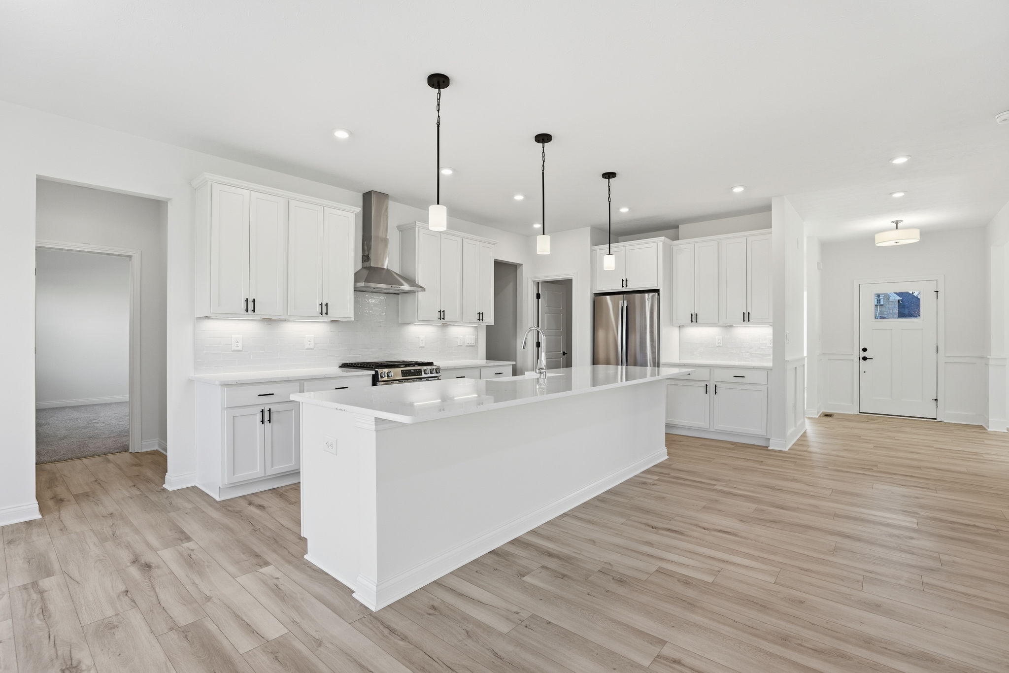 stage this kitchen like a model home in crate and barrel vibe add 4 barstools at counter add a rug runner in muted tones to the front foyer area