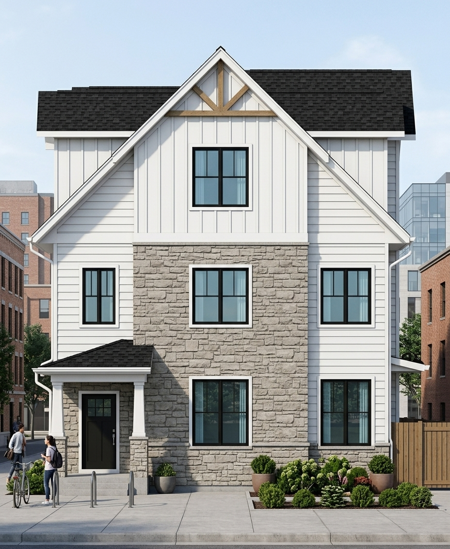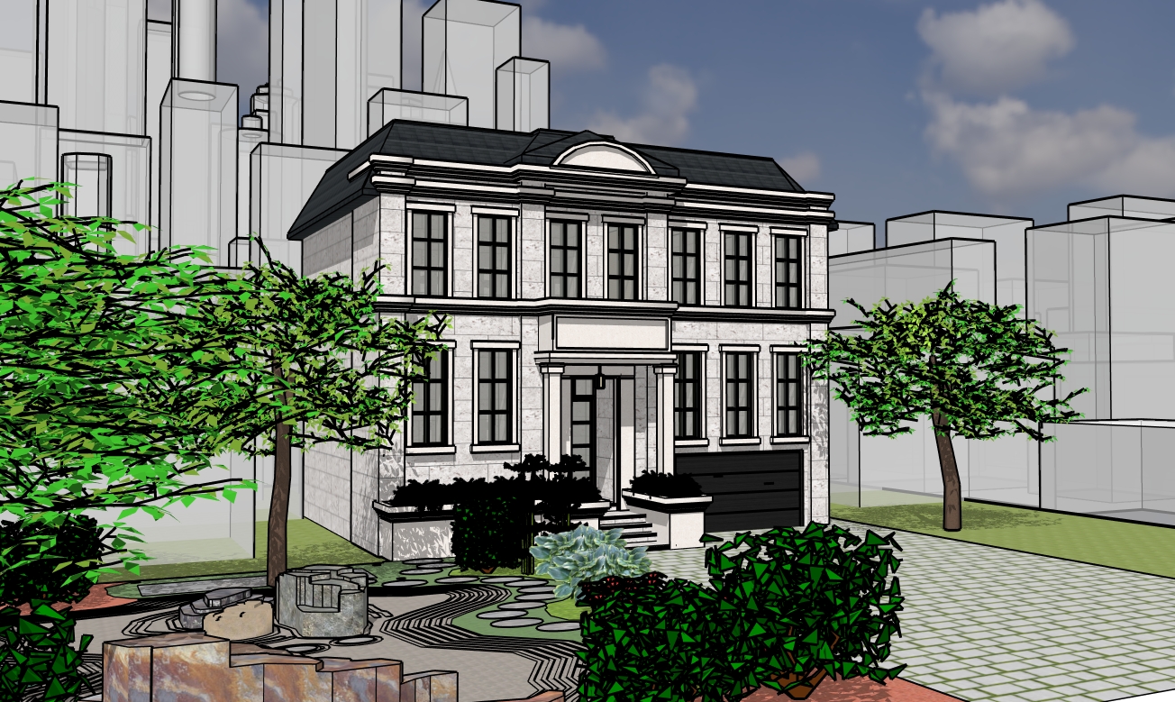 render a photorealistic 3d perspective of this house the neighbors are foggy and not visible the house is in limestone light gray with 24 lengths daytime light and reflections on the windows