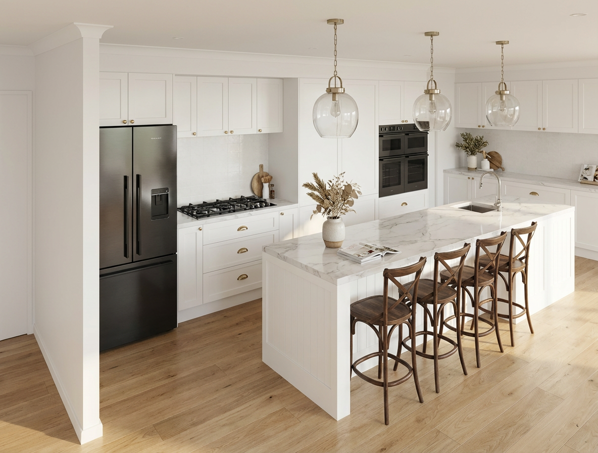 photorealistic interior render of an australian hamptons style kitchen shaker style cabinetry including for the island in crisp white with brushed brass cup pull hardware island bench with a calacatta marble benchtop featuring soft grey veining vj panel detailing on the island front light oak timber flooring dark walnut crossback bar stools three oversized glass and brushed brass pendant lights above the island integrated stainless steel appliances soft coastal colour palette white walls warm off white cabinetry sandy beige accents coastal styling accents including a ceramic vase magazine quality architectural photography ensure the fridge and double stacker oven are black warm beige white tile splashback behind cooktop brushed nickel tapware