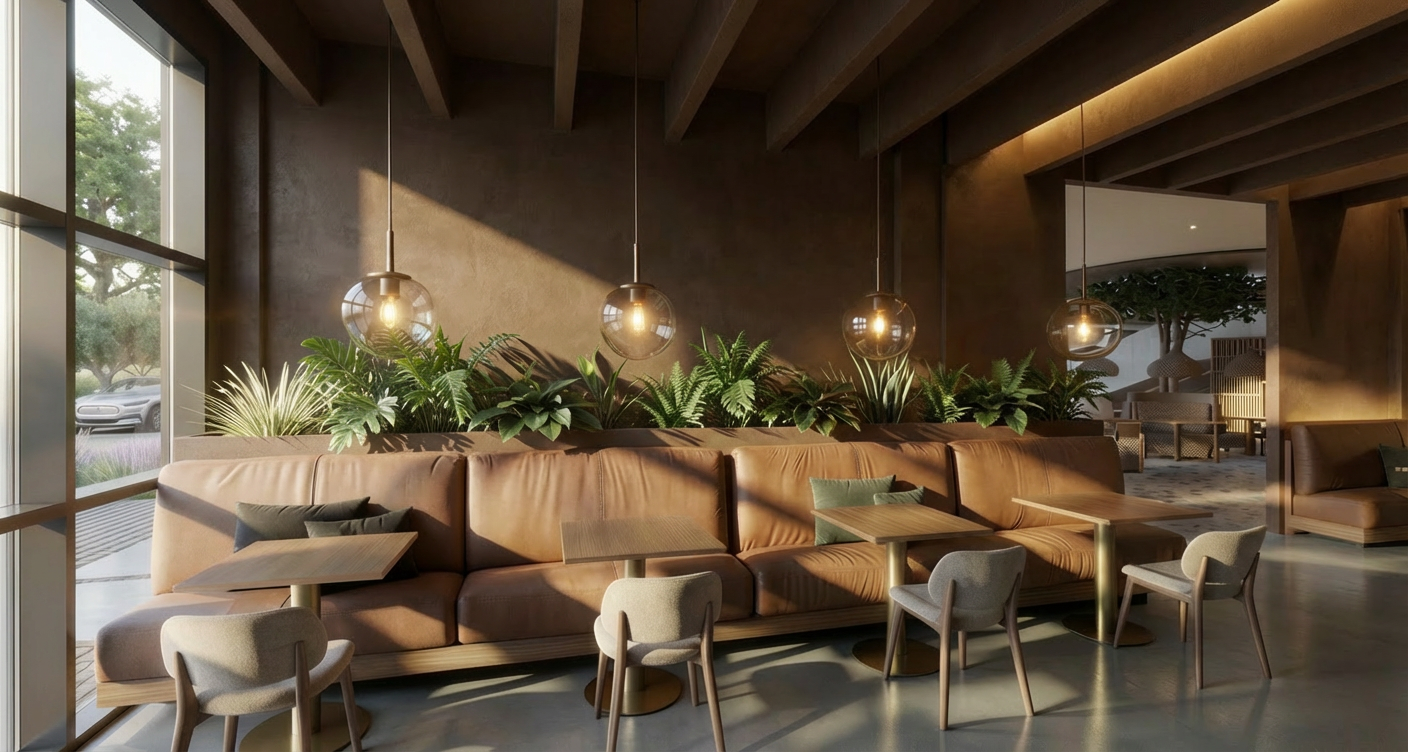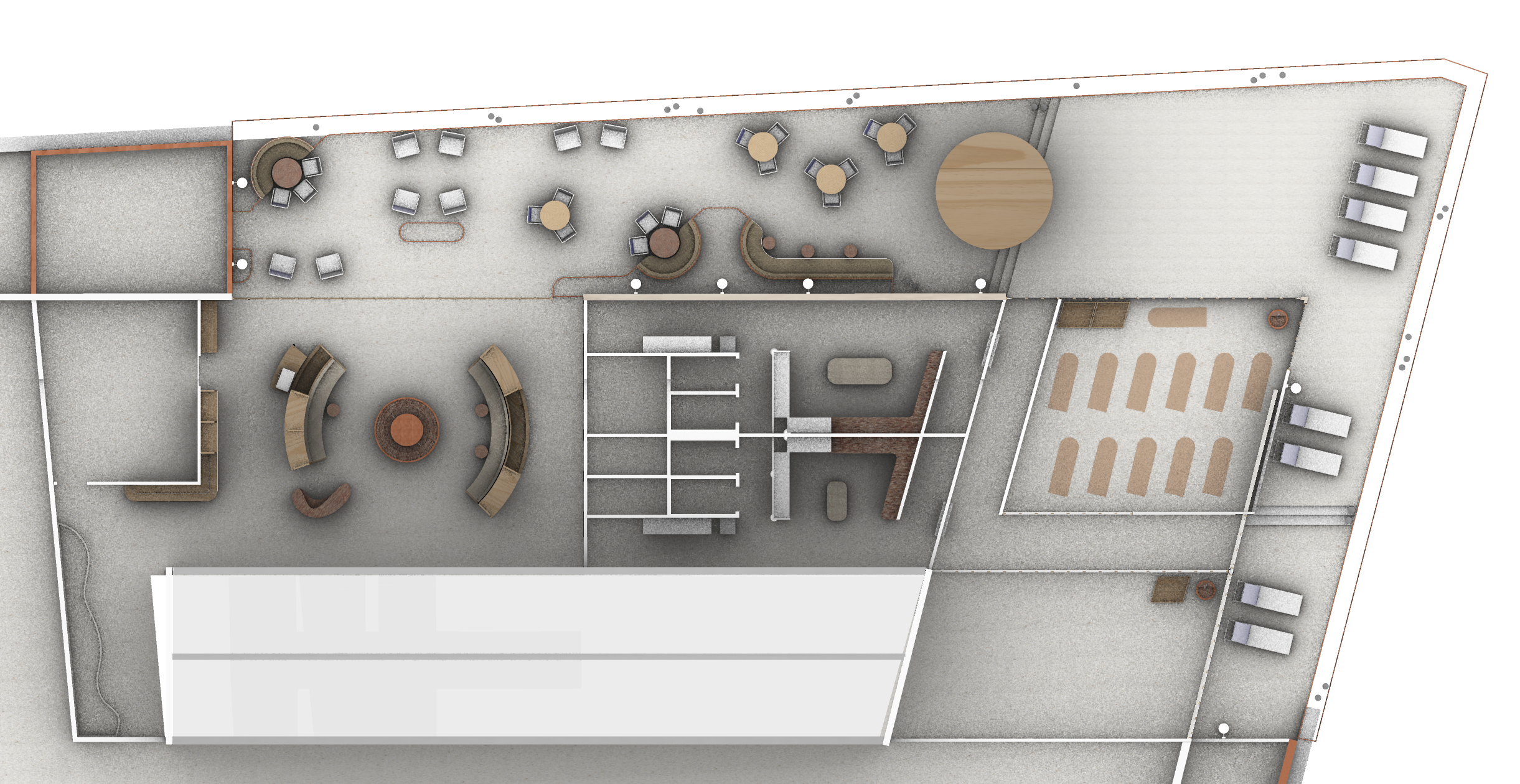 can you render this floorplan with materials there are materials there now but you need to make it more real and apparent overall floor surface is light terrazzo the counters in the corner of the changing rooms are red terrazzo the counter of the curved reception desk is red terrazzo as well the round central sink is in red terrazzo with terracotta as the core the wood is pine wood the white wide band wraping the edge and top right corner is terracotta planters so fill inn plants in these as well as the freestanding oval planter that is placed behind two of the chairs on the outdoor terrace as you can see there are three bespoke sofas out on the terrace two round ones and one that is curved and then ends straigth these sofas are in wood with textile on the seat and backrest there are also the same terracotta planters behind wrapping these bespoke furnitures put plants in these as well on the right side there are two seperate rooms one with yogamats and one that is meant to have 5 reformer pilates benches as you enter on the left side out of the elevators you are met with an organic shaped planter along the wall that is made of the same light terrazzo as the floor put plants in this one as well