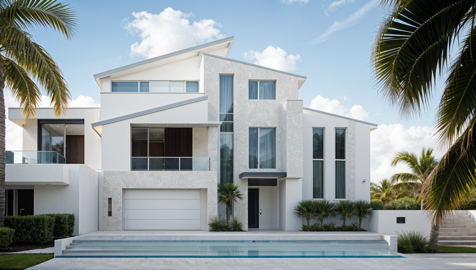 modern two story house with clean angular architecture the facade features a mix of textured white and light grey stone large windows with sleek black frames enhance the contemporary design the sloping roof is a deep charcoal color add lush green bushes and plants at the front providing vibrant contrast the garage door is a sophisticated light grey overall aim for a peaceful elegant atmosphere with soft natural lighting show a paver driveway architecture