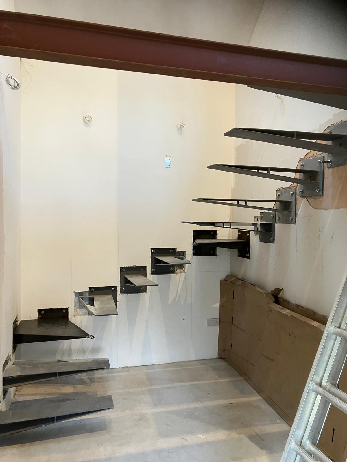 open rise stair case all steel in picture to be covered in oak oak hand rail glass balustrade