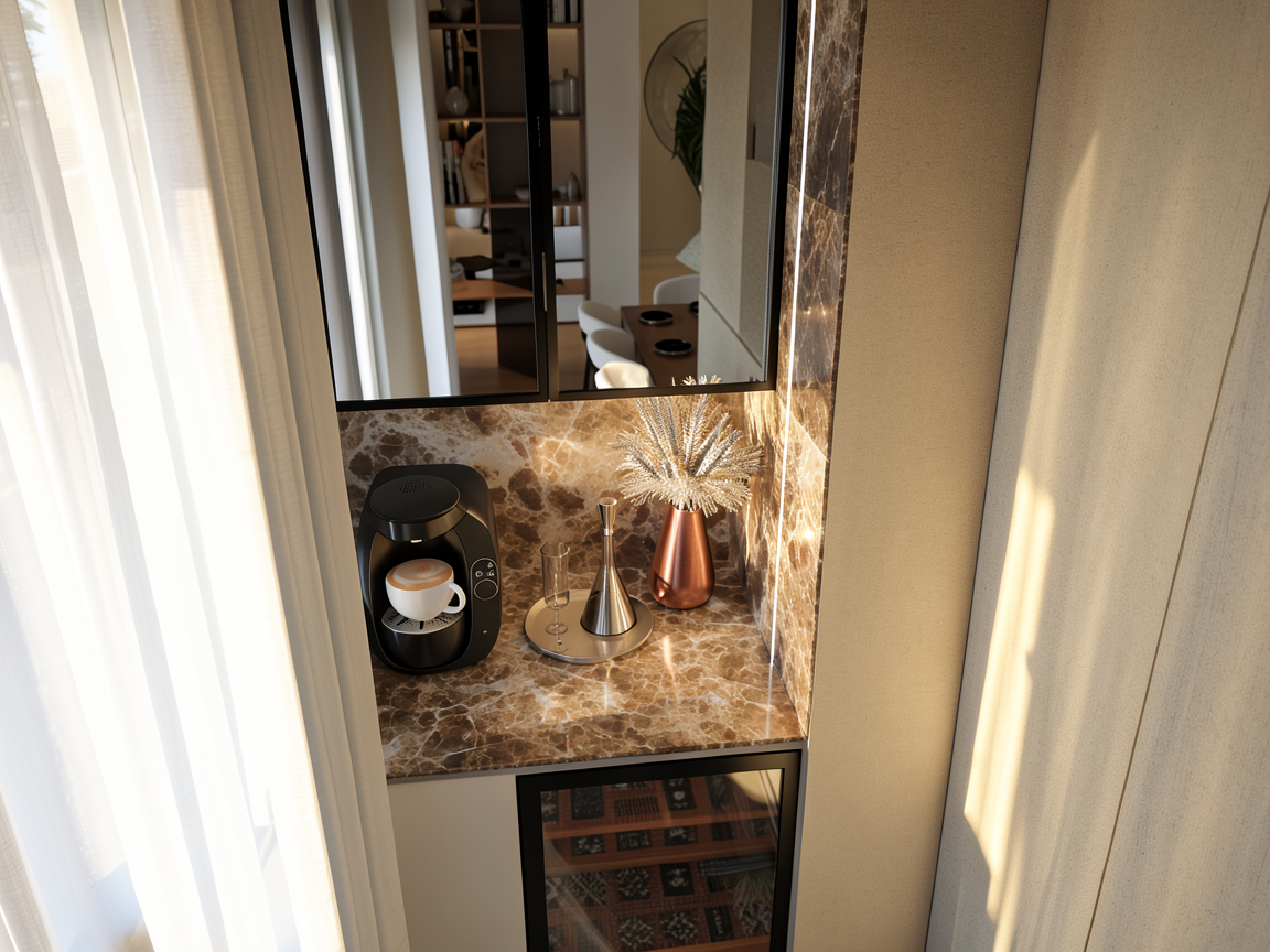 extreme close up photorealistic rendering of a luxury humidor detail a translucent cristallo stone surface is backlit from beneath with integrated led lighting creating a soft glowing effect that highlights the natural veining and depth of the stone the light should feel warm diffused and elegant showcasing the translucency of the cristallo below the illuminated stone a partially open pull out drawer crafted from rich spanish cedar is revealed inside the drawer cigars are carefully arranged alongside curated vintage cigar lighters and accessories displayed with intention and refinement subtle integrated led strip lighting is concealed within the drawer and surrounding millwork casting a warm ambient glow that enhances the reddish tones of the cedar and adds depth to the cigars and metal finishes of the lighters focus on material contrast and craftsmanship glowing stone above warm wood below soft reflections and precise detailing shallow depth of field cinematic lighting ultra high detail luxury residential interior context moody sophisticated and gallery like presentation