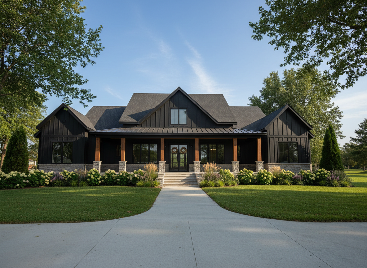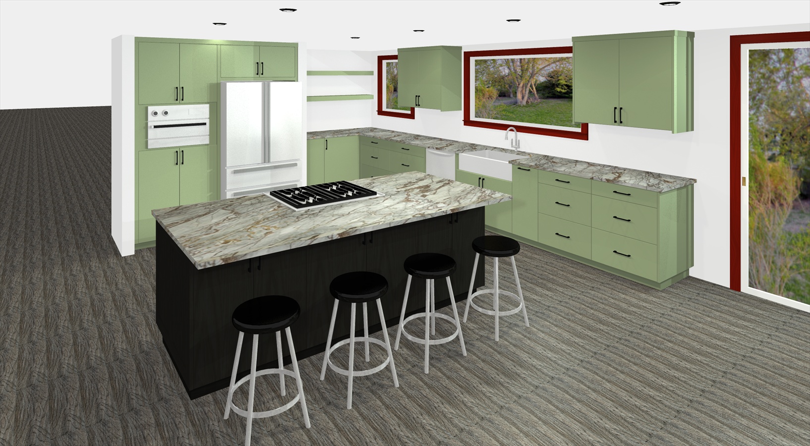 white ge cafe appliances in the room rustic wood looking tile floor toe kick lighting along with under cabinet lighting and lighting in the floating shelves make shelves the same dark grey color as the island white tile full backsplash under cabinets and the whole wall where the floating shelves are rustis wooden stols at island red tone wooden trim on windows and doors and base molding exterior view is farmland