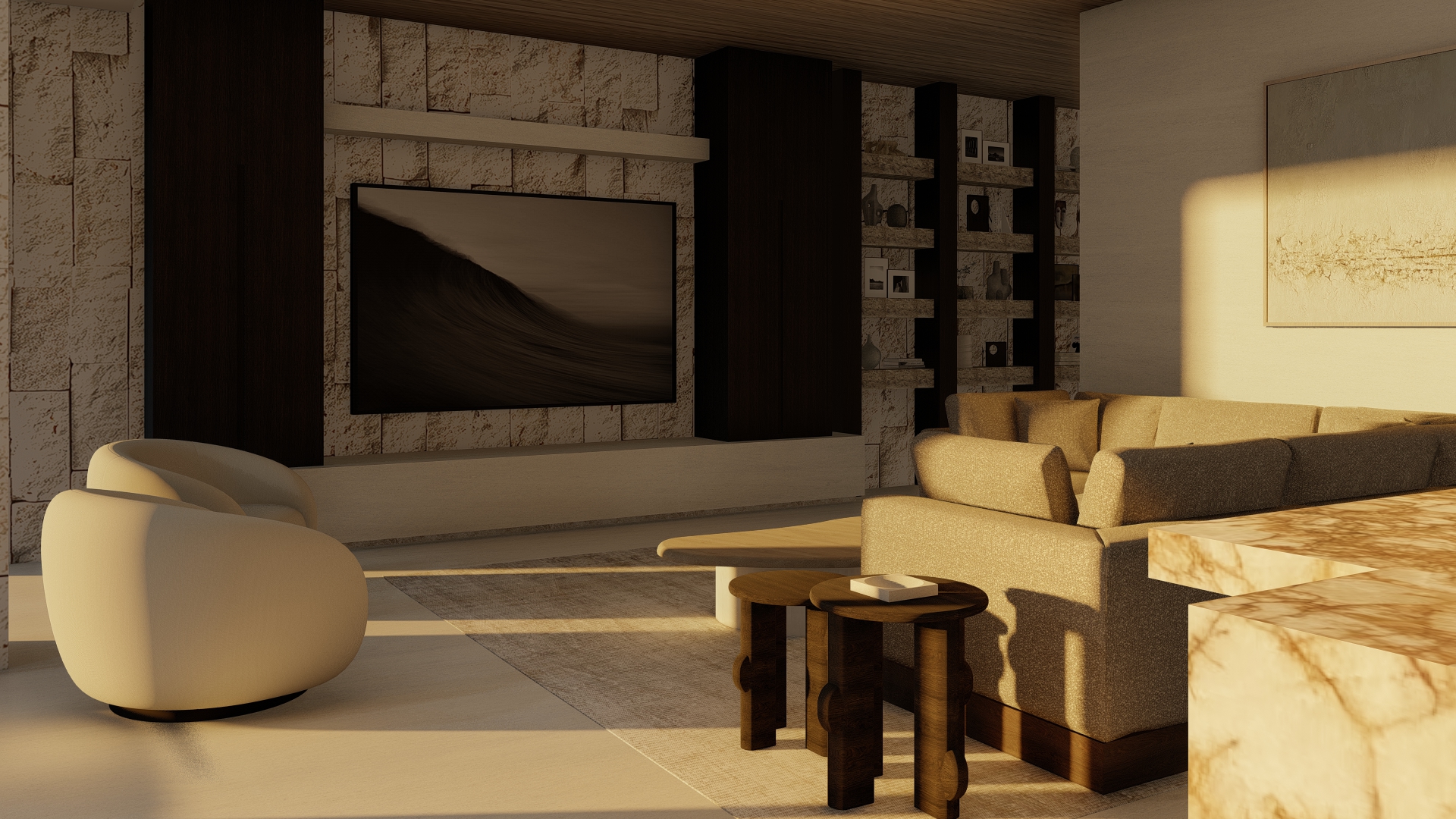 add mood lighting in soffits and shelves like a lighting designer would design to showcase their work add some can lights and make this image look the best work of a lighting designer