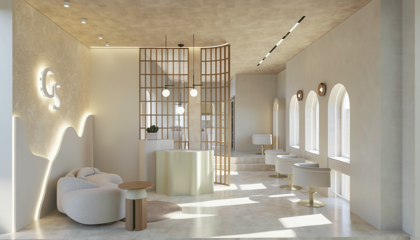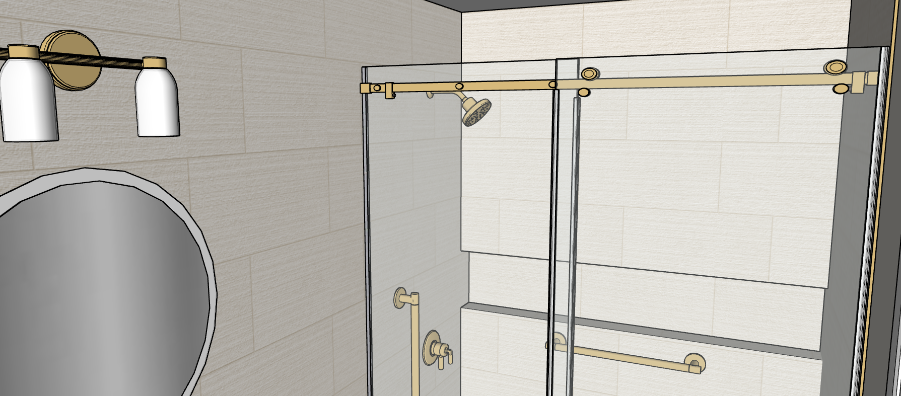 preserve all existing textures geometry materials colors and proportions overall scene is evenly brightened using neutral warm lighting only do not add highlights glow reflections or new light sources lighting comes only from the vanity light with white semi transparent scones warm and mirror with soft white semi transparent backlit halo warm evenly diffused there is no sunlight nor any light source other than the vanity light and backlit mirror the shower head and all shower fixtures are not light sources and emit no light all metal hardware and accessories are brushed brass the tile walls are unicolor heavy with 3d horizontal chiseled texture with a color code rgb 234 228 218 walls with no tile on them are painted in a rgb 234 228 218 color the light switches are white