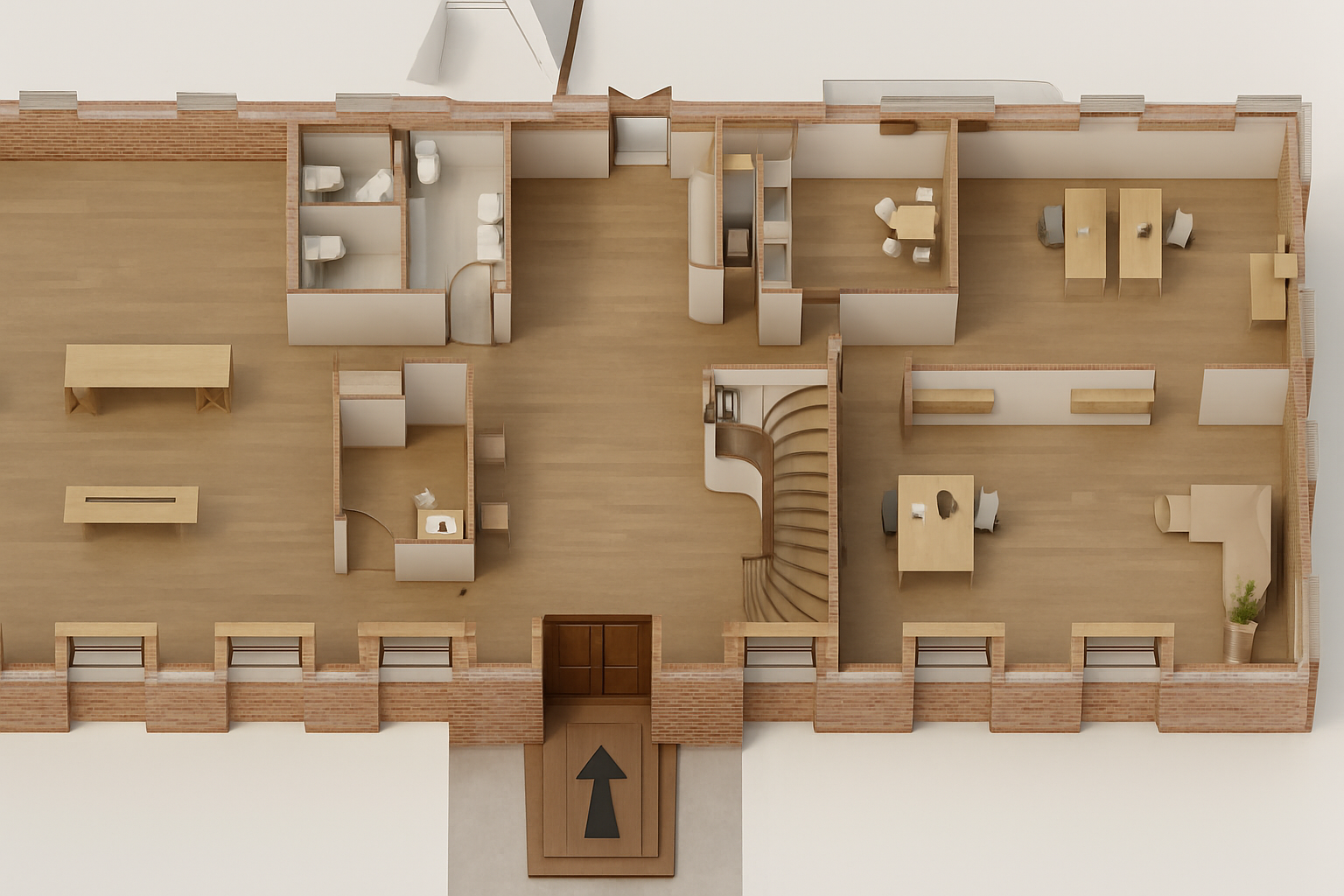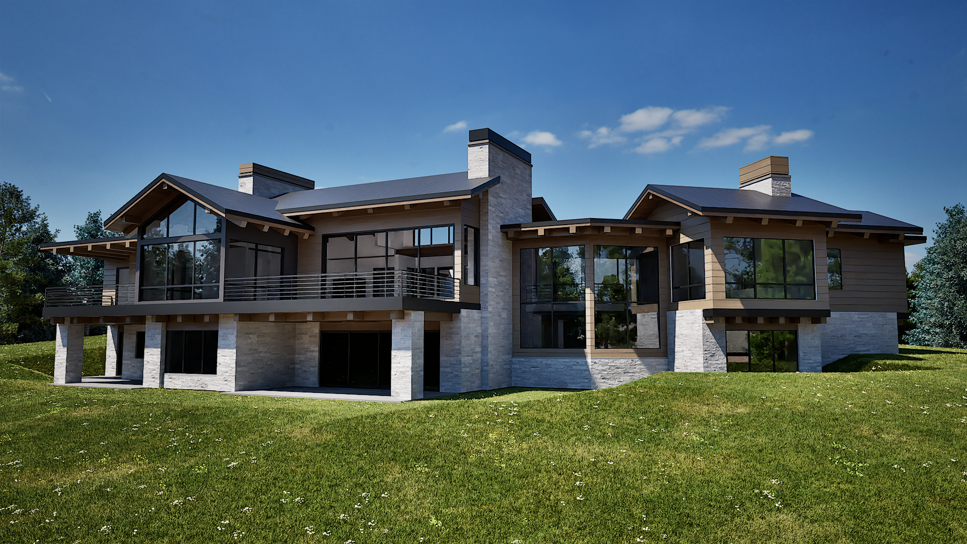don t change the structure i want the environment to be a cool sunny day with a few clouds i want more vegetation in the background and more landscaping around the exterior of the house add lights illuminating from the windows make the exterior materials feel more realistic and natural
