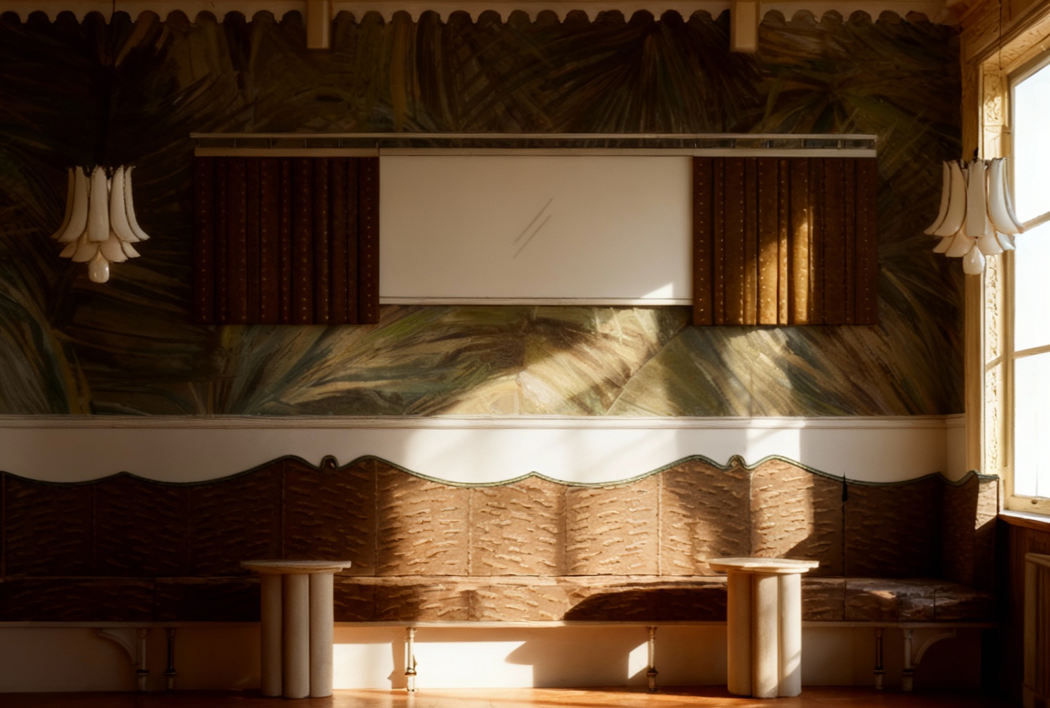 change the piping trim to light blue change the banquette legs to brass remove the tables make it a sunny day