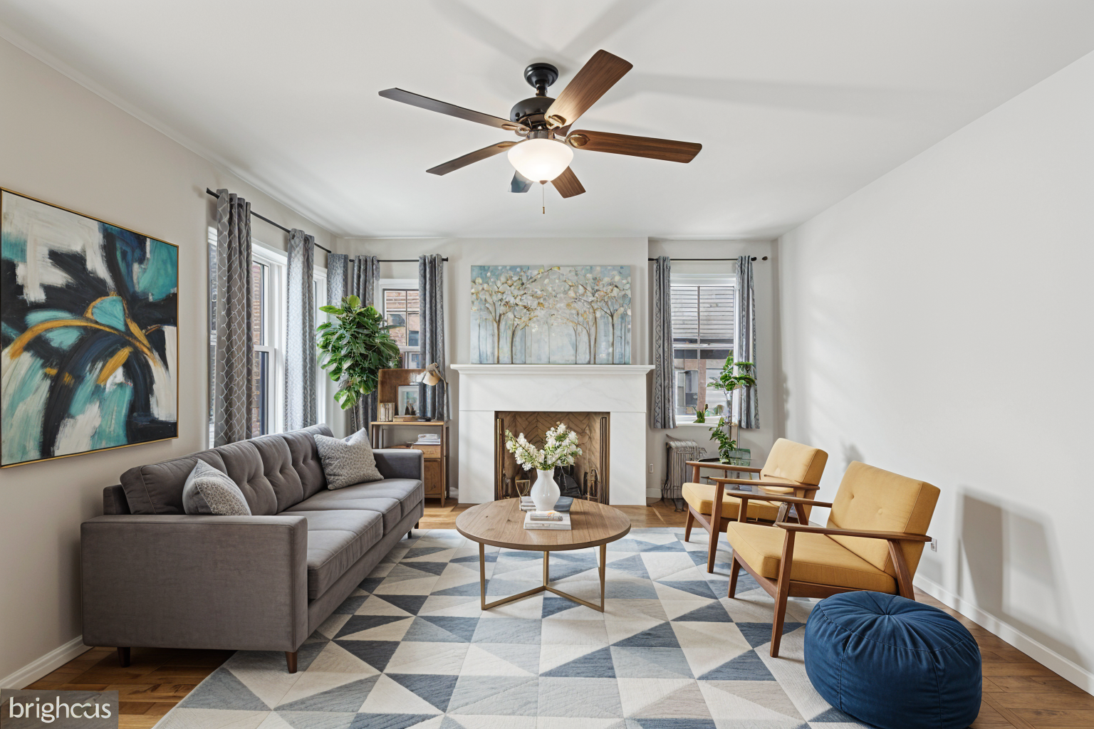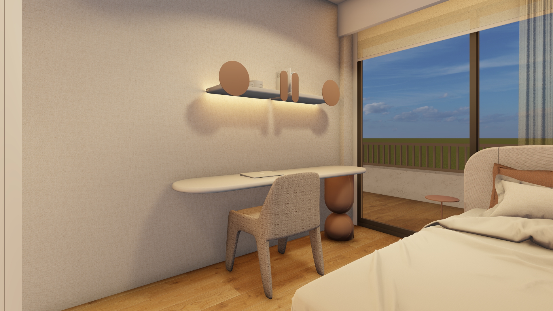 render this image in a realistic style maintaining the exact same composition furnishings lightning and design without adding or removing elements the leg of the desk is not made of wood it is painted antique pink
