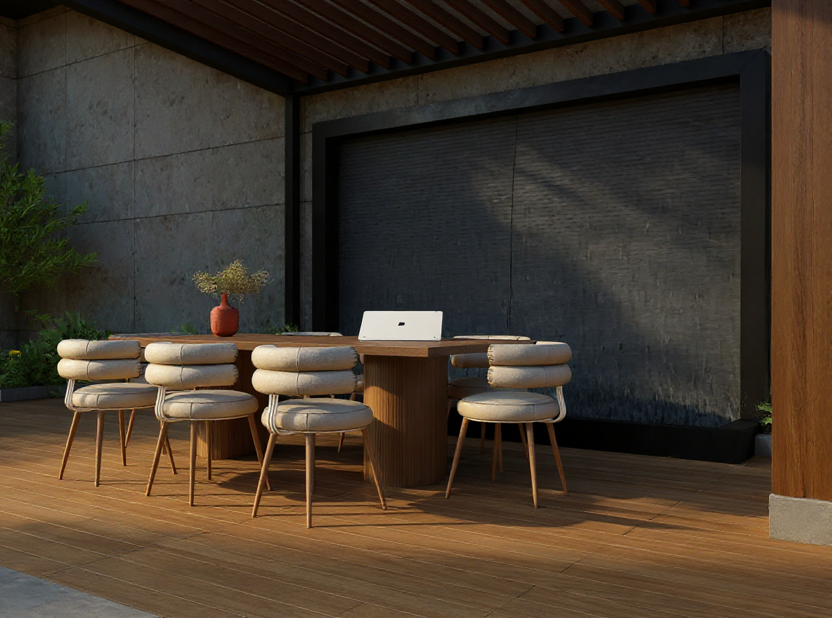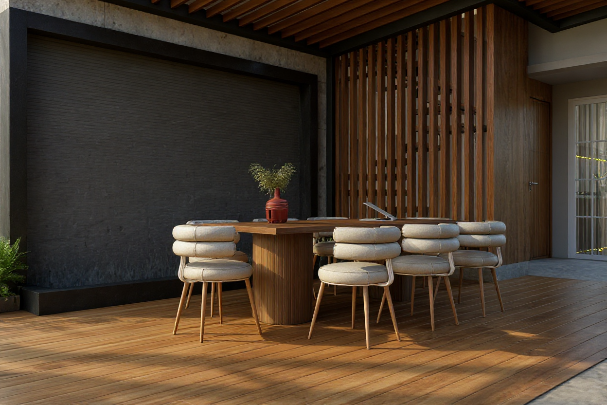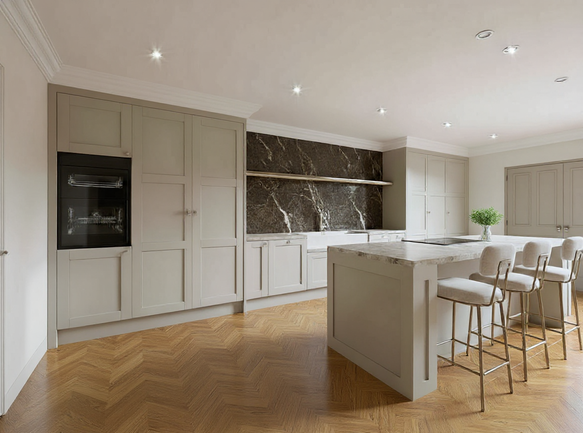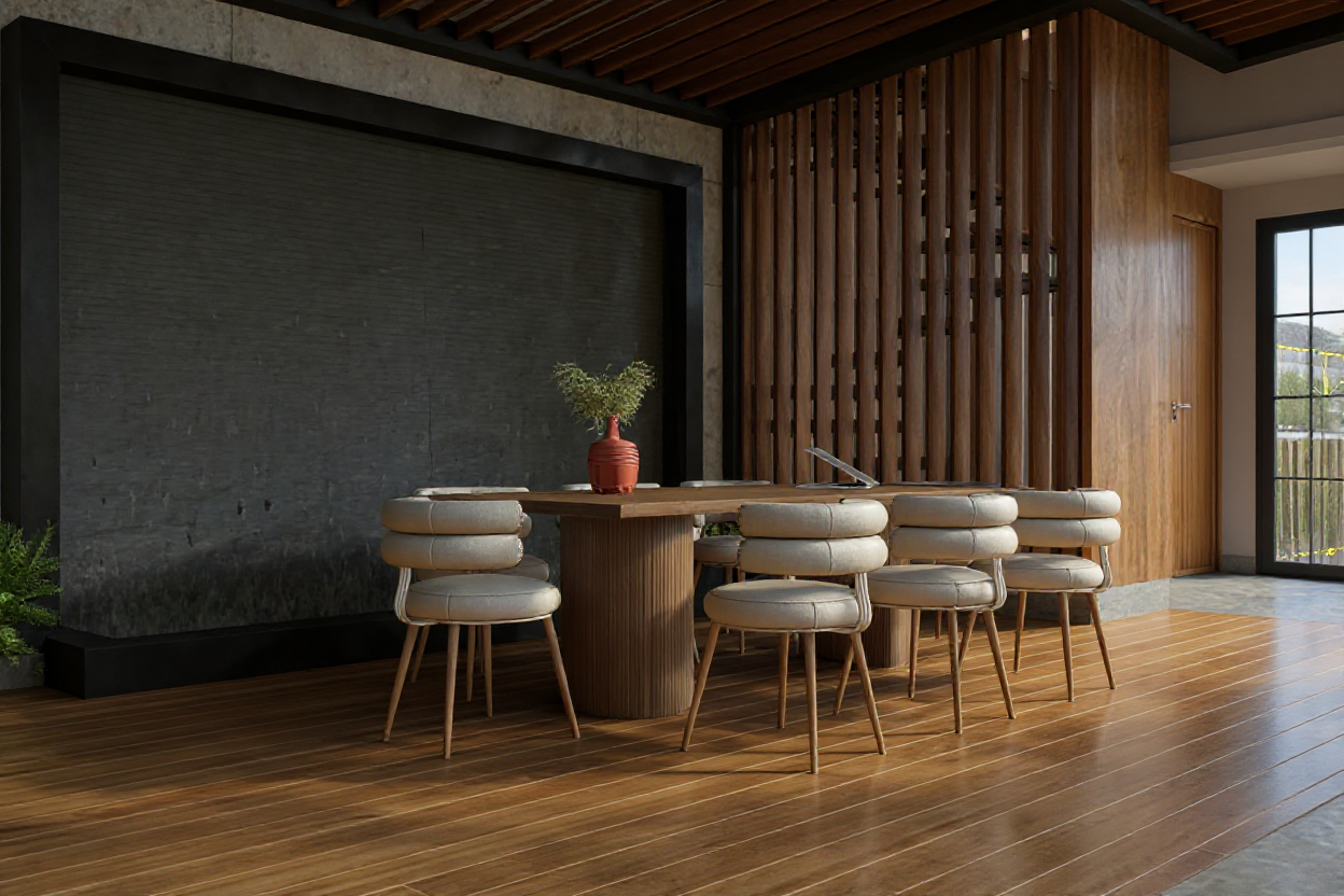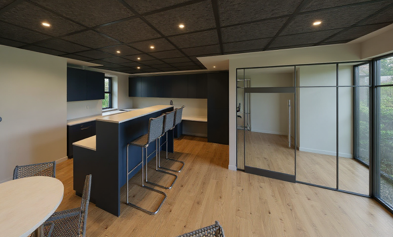change ceiling to a dark charcoal suspended ceiling grid with square ceiling lights in every third ceiling grid of full ceiling tile size include glazing to door and wall to right side leading to corridor light timber oak flooring throughout add some vegetation throughout the kitchen area change the seating around the round table to a grey fabric finish kitchen units to be dark navy blue