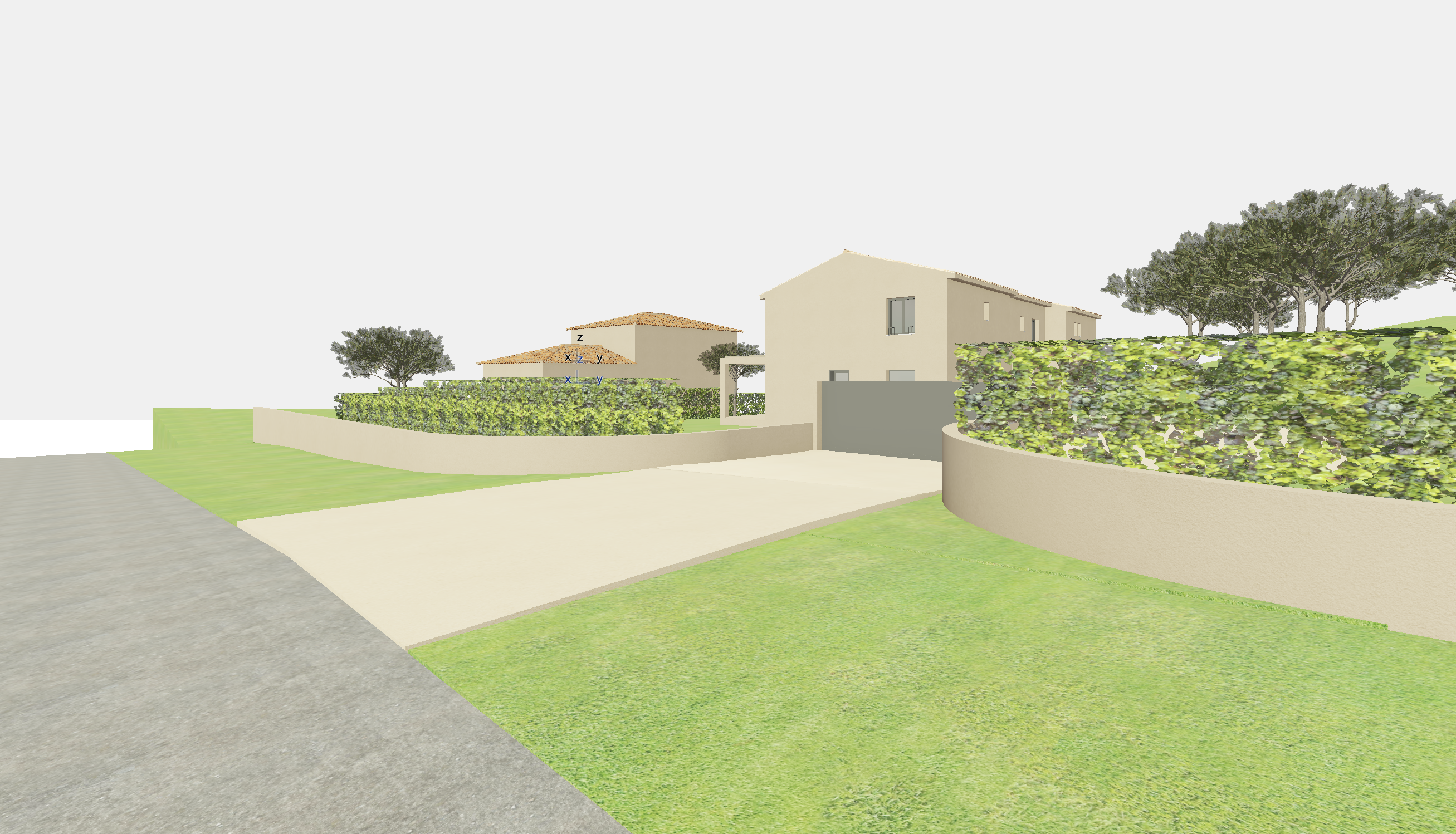 some mediterranean pine trees in the background reflects on the windows and lot of sunlight the vegetation hedge is composed of lilas and laurels