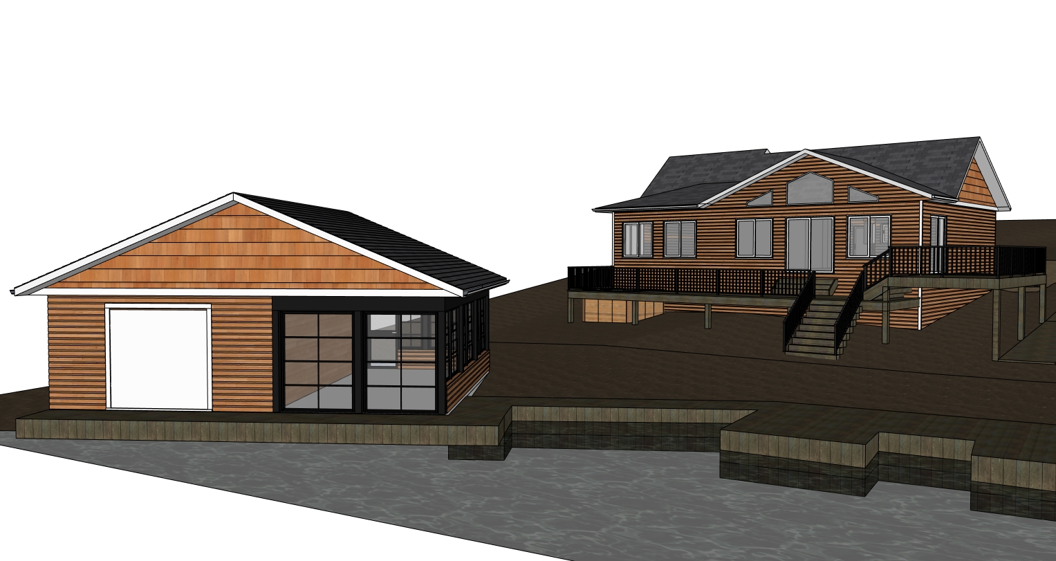house is in cabin country surrounded by spruce pine fir birch and poplar sun is setting in the background