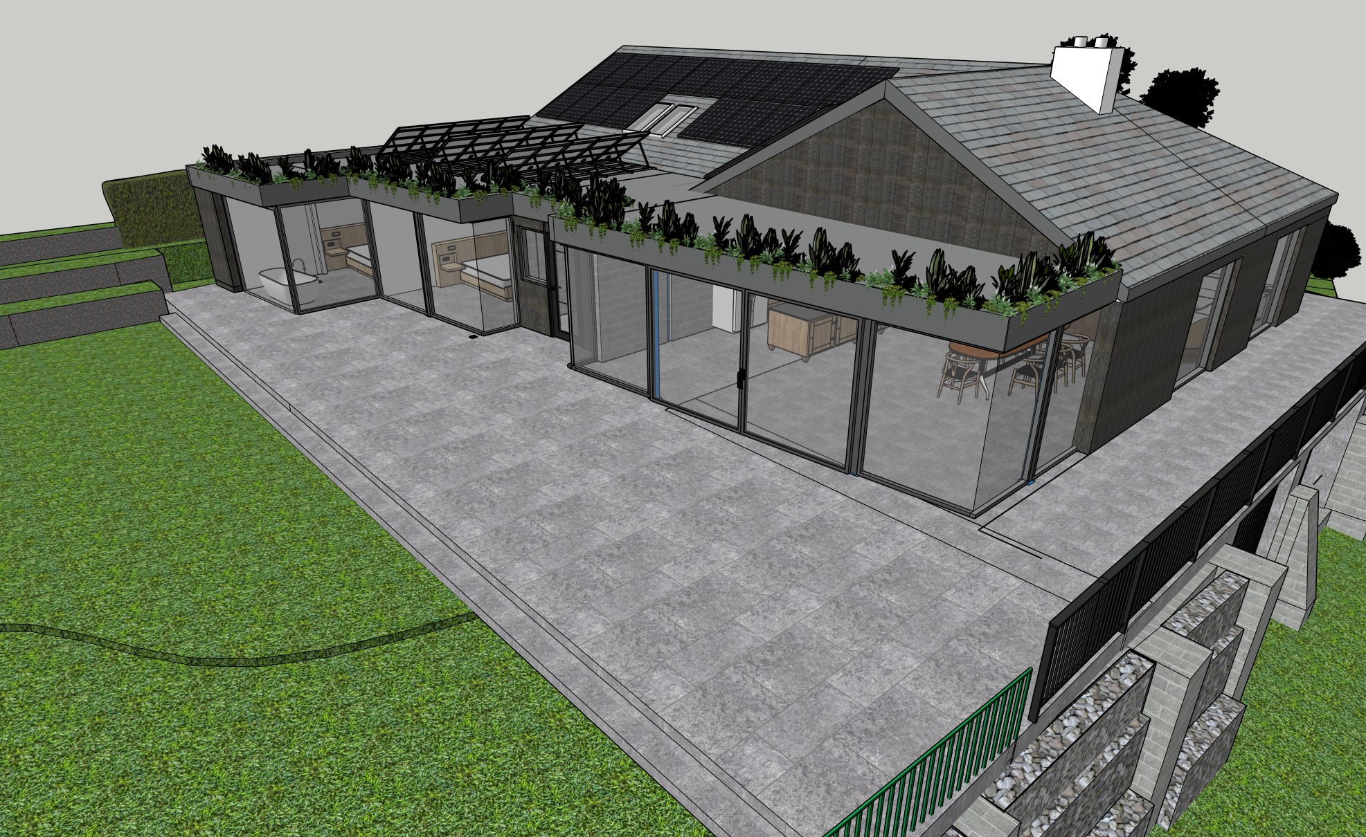 split level bungalow with flat roof extension glass floor to ceiling windows with anthracite grey frames burnt larch wall cladding and into wall of pitched gable pv panels on roof with some v pnels on frames on flat roof plants on grey parapet