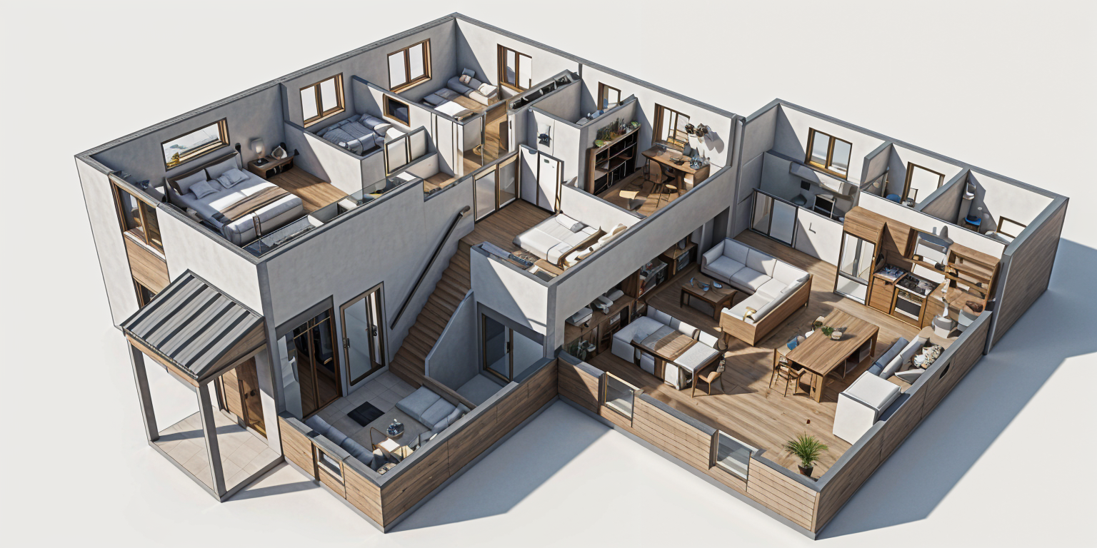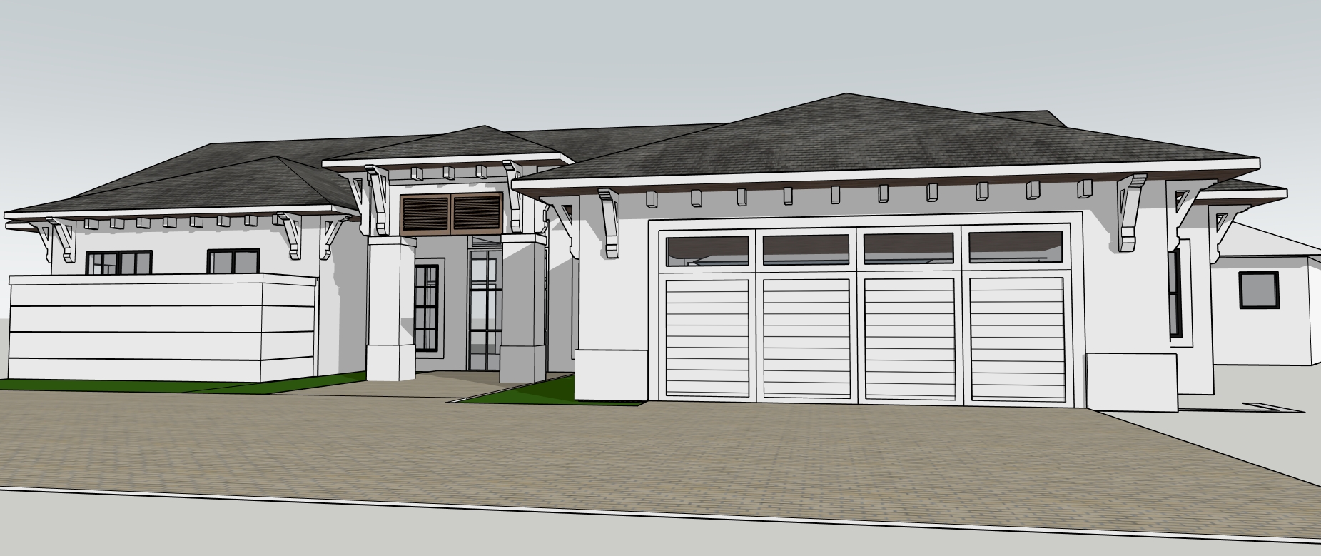 create a hyper realistic exterior photograph of a coastal house front exterior during a vibrant sunny day the house has a sleek tropical modern design with crisp white walls and white wood brackets the roof has dark gray cement tile large glass windows reflect the clear blue sky the garage door is white wood with some small glass openings palm trees with their lush green fronds add a tropical touch the house has surrounding green lawn the atmosphere is tranquil and luxurious with sunlight casting gentle shadows evoking a sense of relaxation and opulence