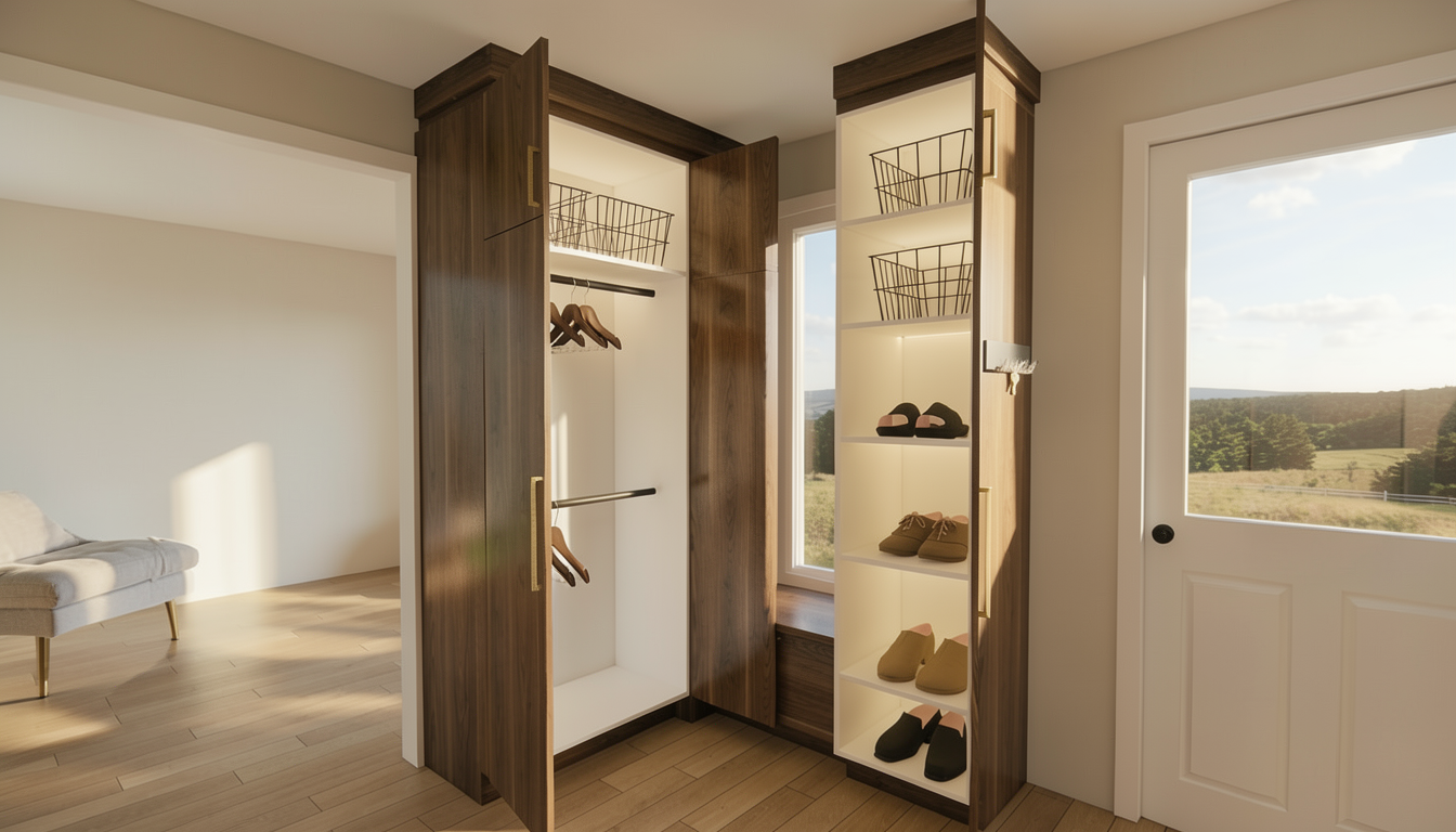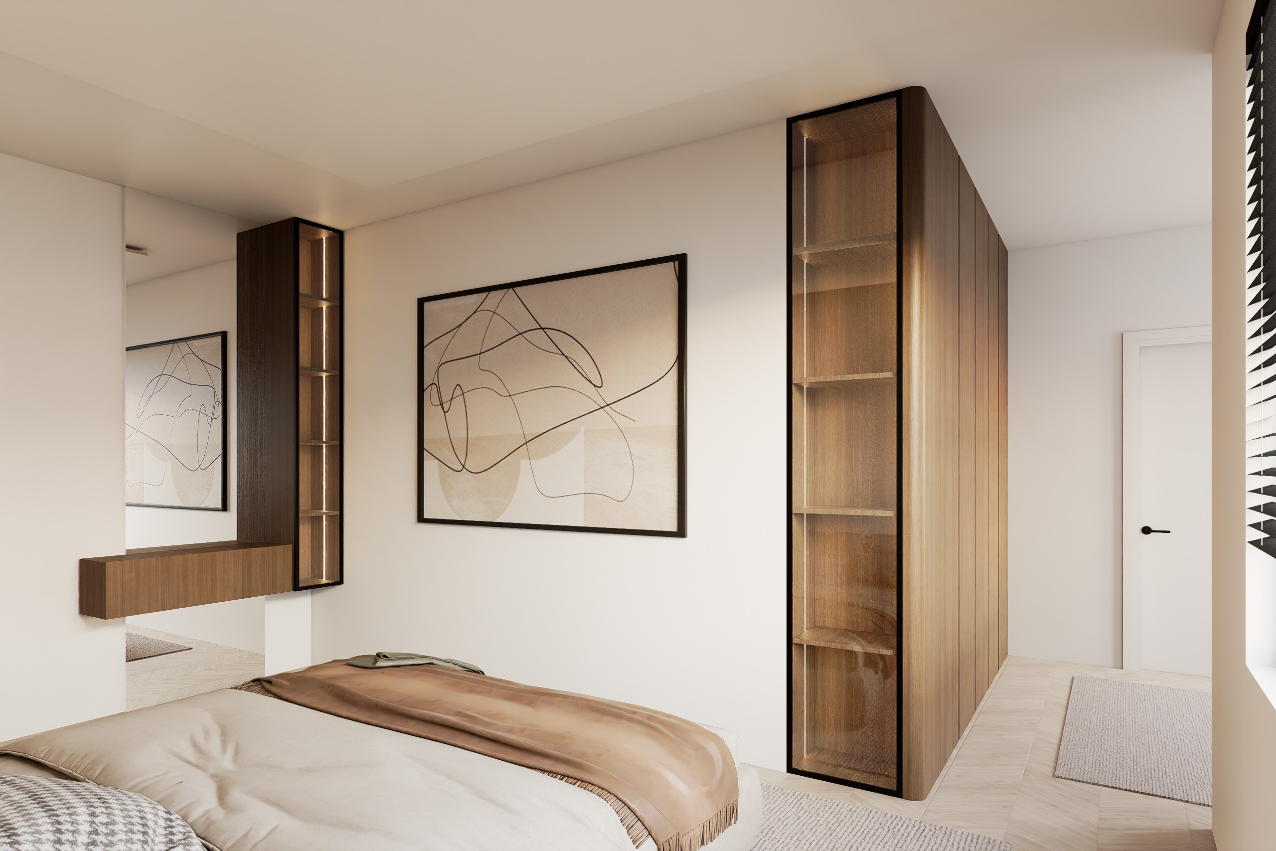 ultra realistic architectural render of a modern minimalist bedroom from a reverse side angle preserve the exact layout proportions camera angle and composition from the reference image color palette soft warm beige tones combined with dark warm walnut wood vertical grain rich natural variation matte satin finish foreground bed partial view of upholstered bed in soft beige fabric realistic fabric folds soft natural creases neutral bedding with warm brown throw subtle sheen natural drape right side tall built in wardrobe in walnut wood vertical wood grain important not horizontal integrated open glass display section with dark frame interior shelves in wood with warm vertical led lighting strips soft glow premium showcase feel center wall large minimalist artwork neutral tones abstract lines proper scale and alignment centered composition left side floating vanity console in walnut wood large mirror above clean reflection no distortion slim vertical glass display unit beside mirror with integrated warm lighting back area minimal white wall with flush door and black handle clean uncluttered architectural lines right edge window with blinds allowing soft daylight natural light diffusion realistic shadow pattern floor light wood flooring soft neutral rugs with subtle texture lighting combination of warm artificial led display units soft natural daylight no harsh contrast balanced exposure realistic shadow gradients and depth materials high end physically accurate textures wood grain clearly visible but refined no plastic look no over gloss subtle imperfections for realism mood warm calm high end residential boutique hotel aesthetic rendering style ultra photorealistic interior editorial quality soft shadows high dynamic range do not change layout or design only enhance realism lighting and material depth