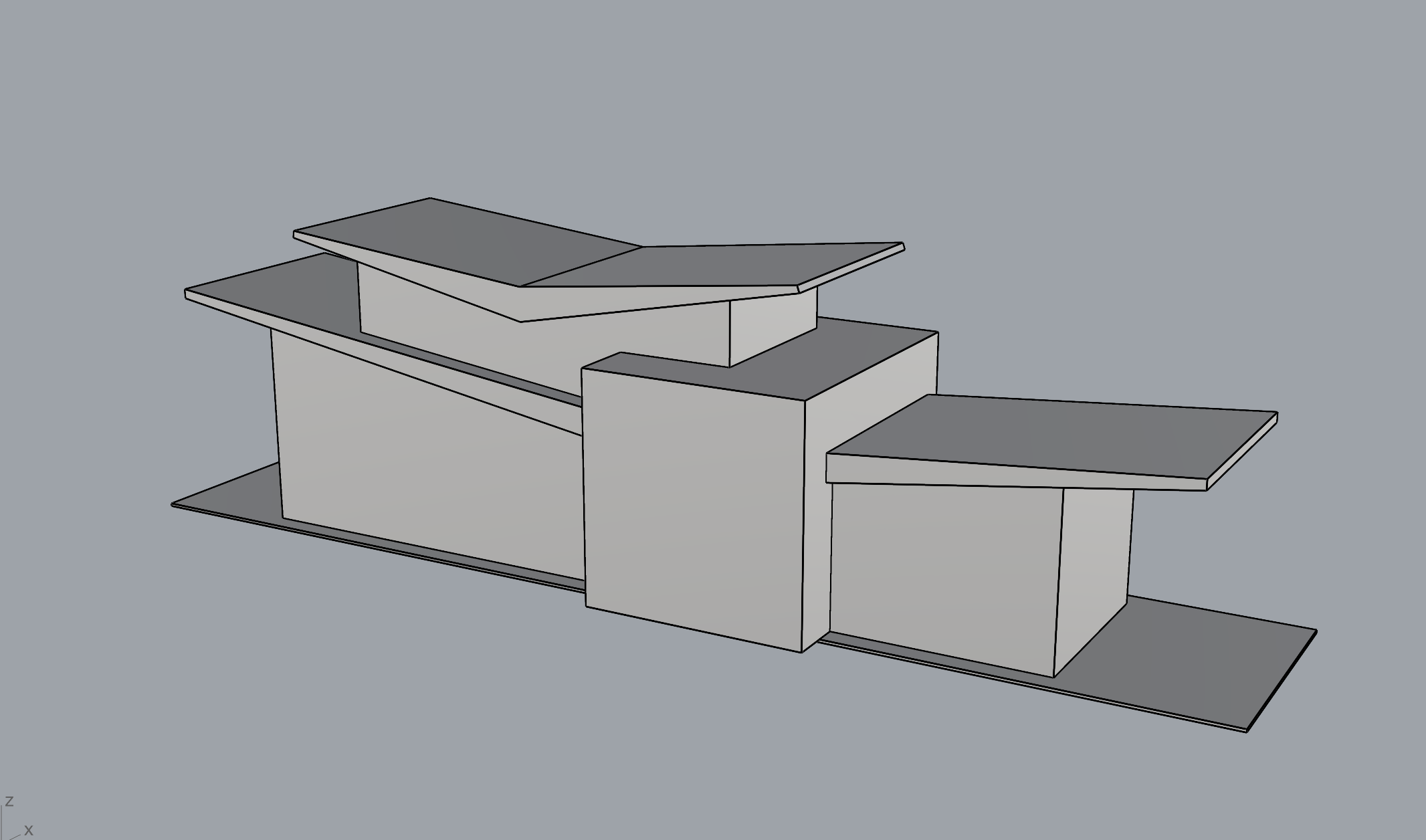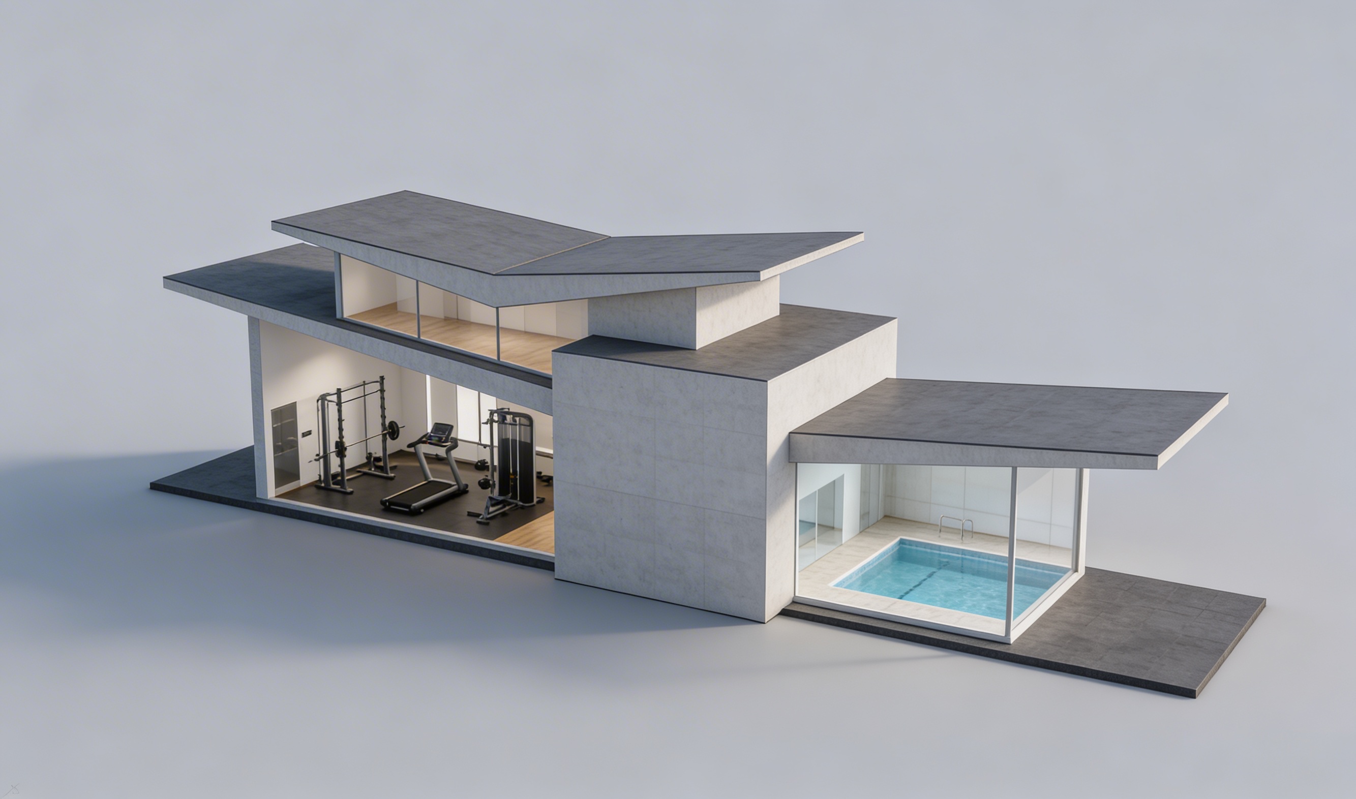 generate an image based on the uploaded photo keeping the existing mass shape position layout and camera angle exactly the same create a sports center that includes an indoor gym and an indoor swimming pool do not modify anything else
