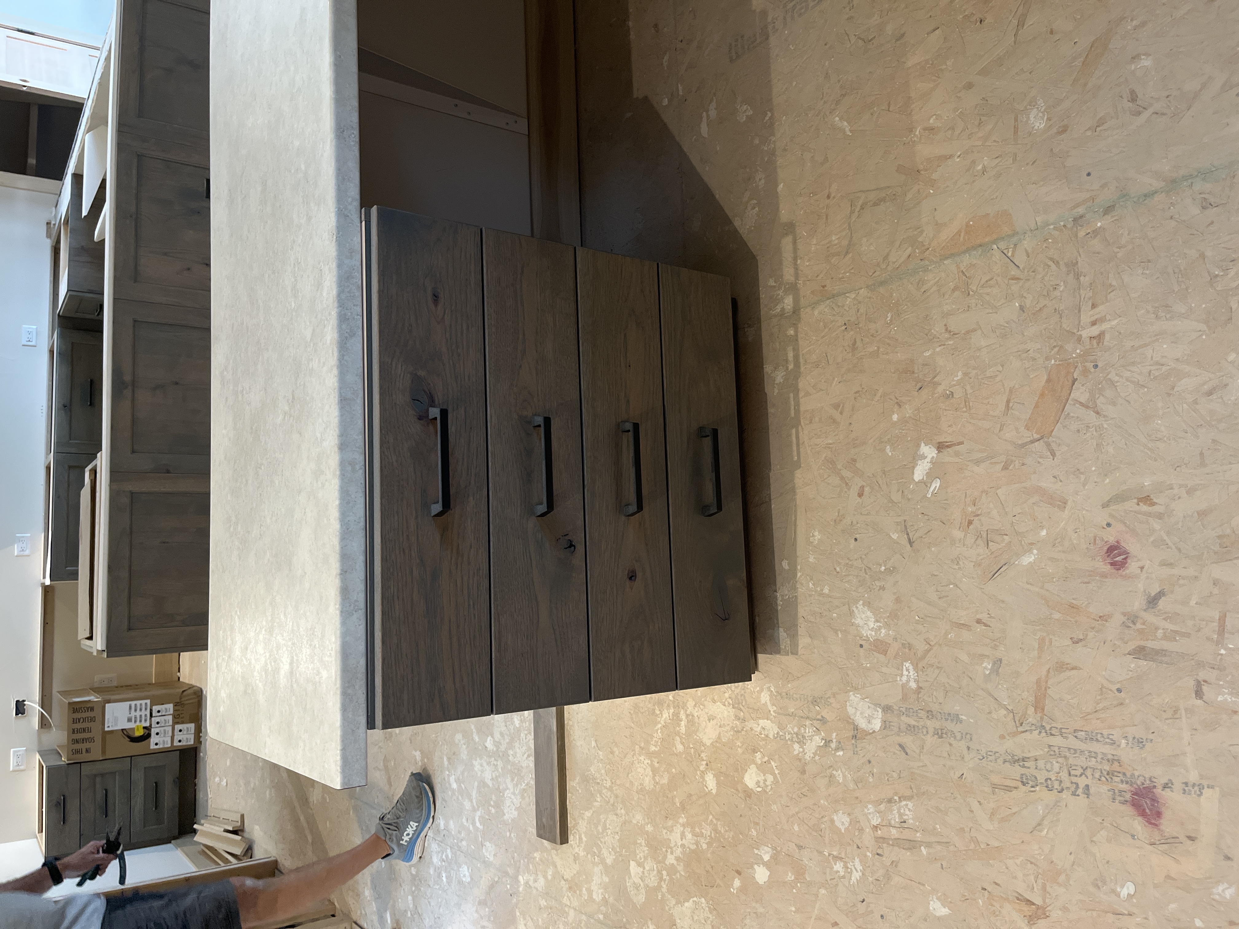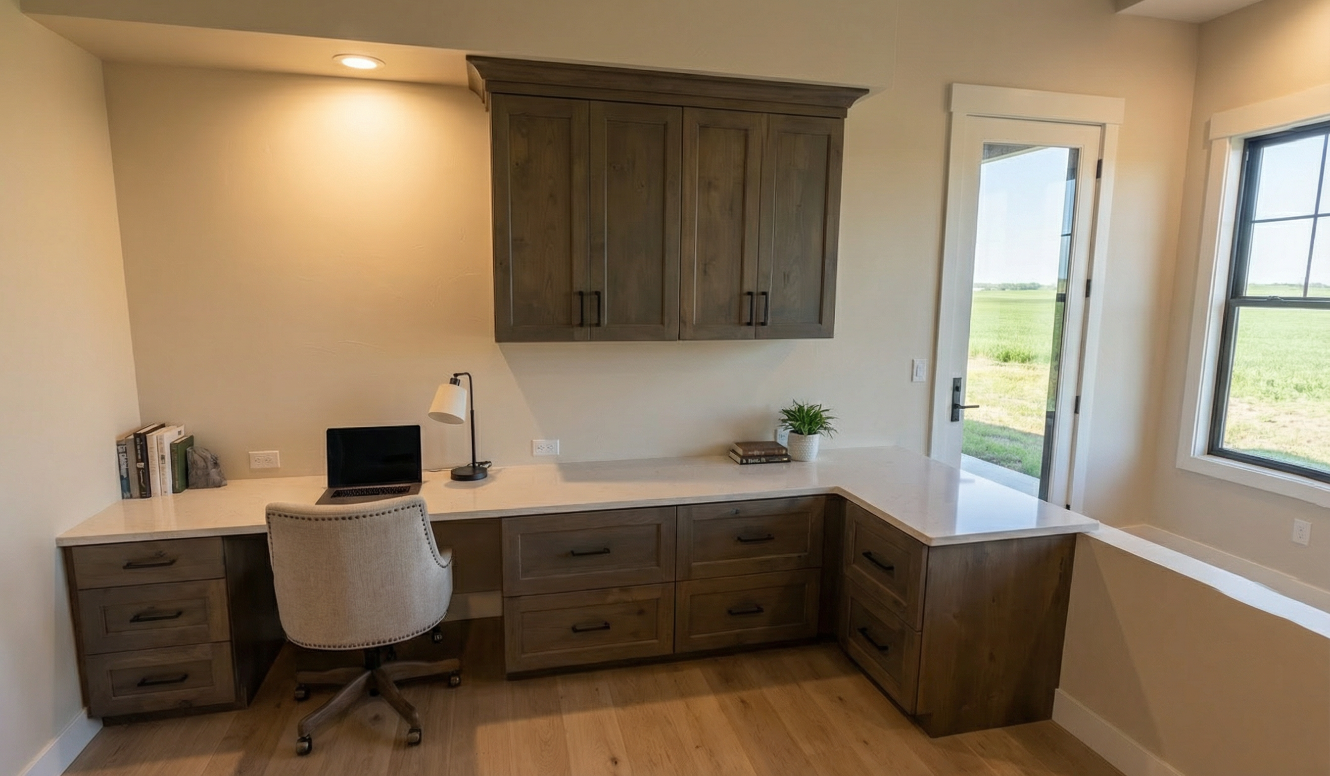 do not change the cabinets in any way preserve the exact cabinet colors materials finishes dimensions door and drawer styles hardware spacing alignment and all geometry exactly as shown do not alter the countertop shape backsplash appliances flooring lighting fixtures or wall structure only remove the construction materials clutter and mess from the scene clean the room and make it look finished and staged add a few simple tasteful home accessories appropriate for the style of the space but do not add or remove any furniture windows or architectural elements maintain the original lighting direction and realism enhance clarity and polish the photo while keeping the cabinetry and room design completely unchanged do not alter the lighting to keep the cabinet colors as they are in the image add new flooring and countertops stage for a home office including a chair