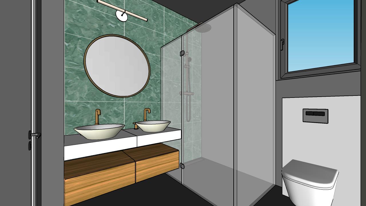 bathroom day rendering original materials decoration towels led ceiling lightening girl showering green and grey tiles