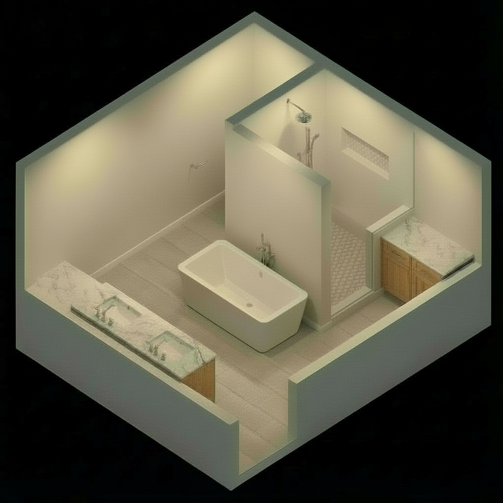 convert this floor plan into a realistic isometric 3d view of a full house show the space from an elevated angle with furniture walls and details visible keep tub wall as is create 2 glass shower walls perpendicular to each other lighten vanity wood use the same furniture as shows on the plan do not change the orientation of the floorplan