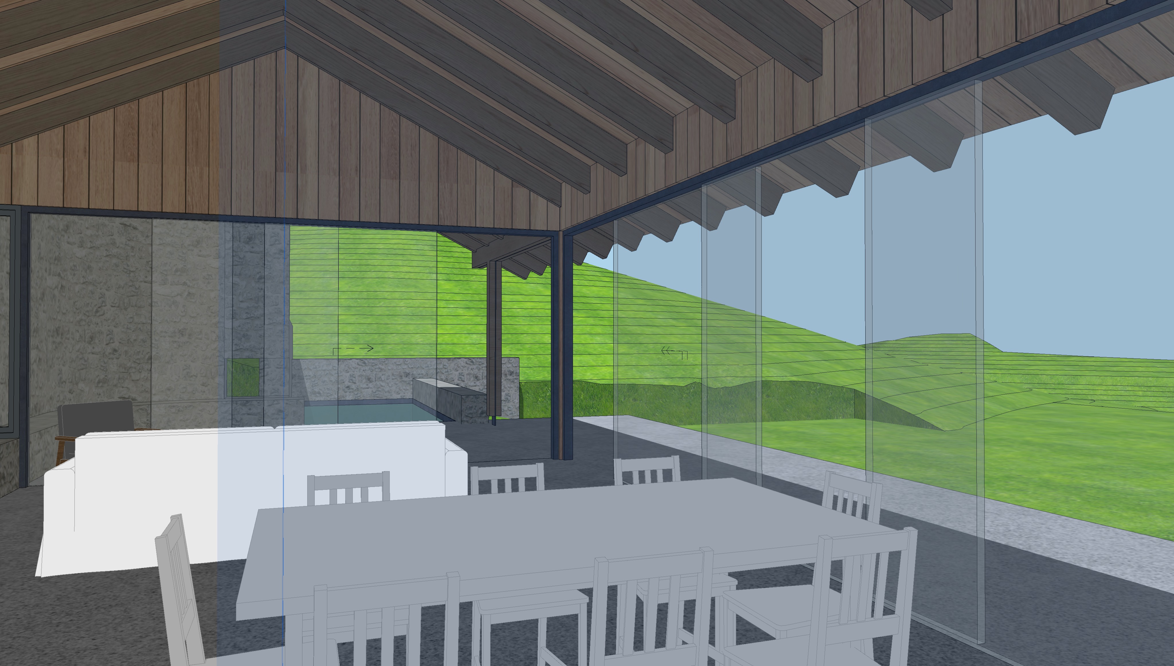 landscape hillside with sagebrush and tall wild grasses brown drystack stone walls corten standing seam metal roof clouds in the sky white oak dining table and chairs add fire to fireplace