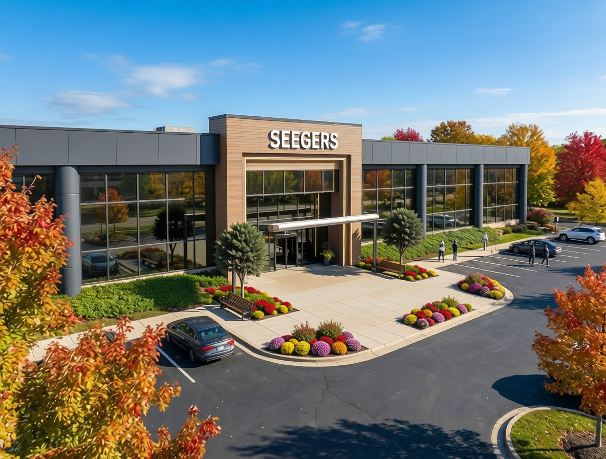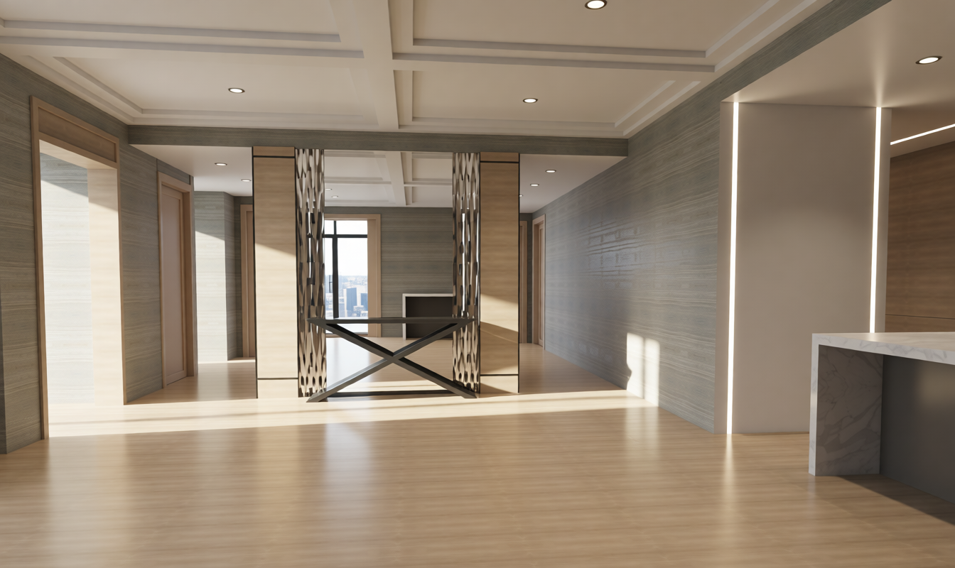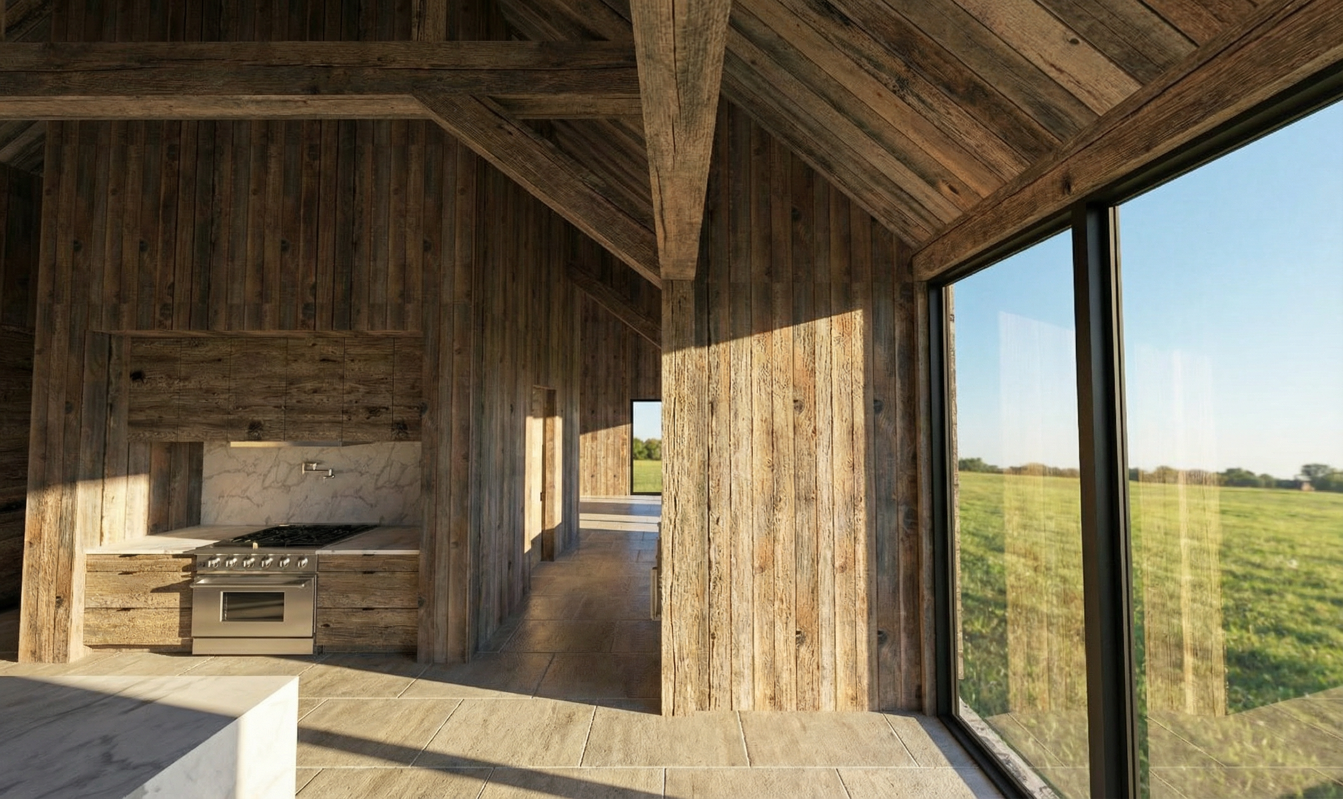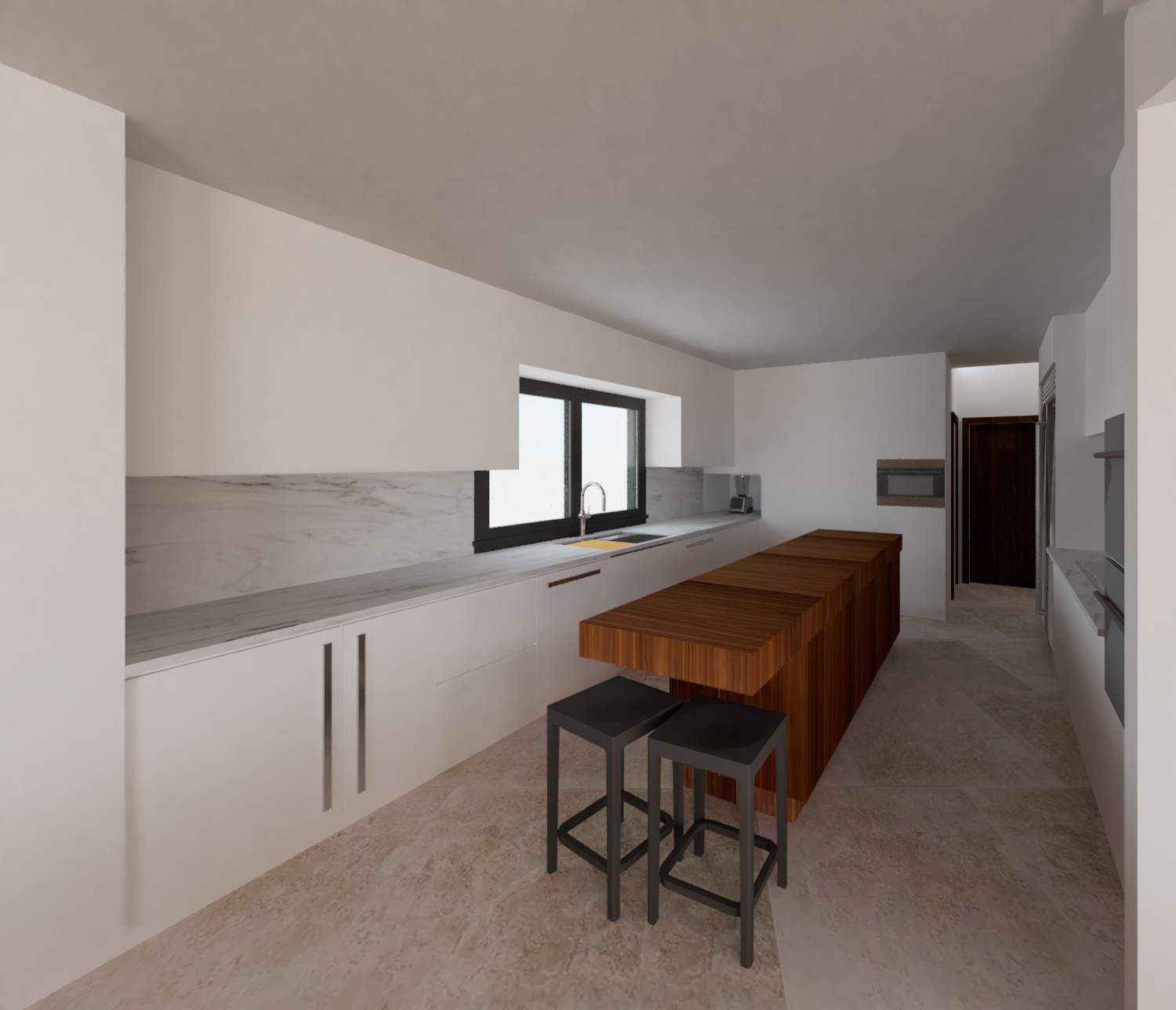 white glossy lacquer cabinets off white limestone tile flooring walnut island with butcher block top and soft ambient lighting with a view of trees and blue sky out the window