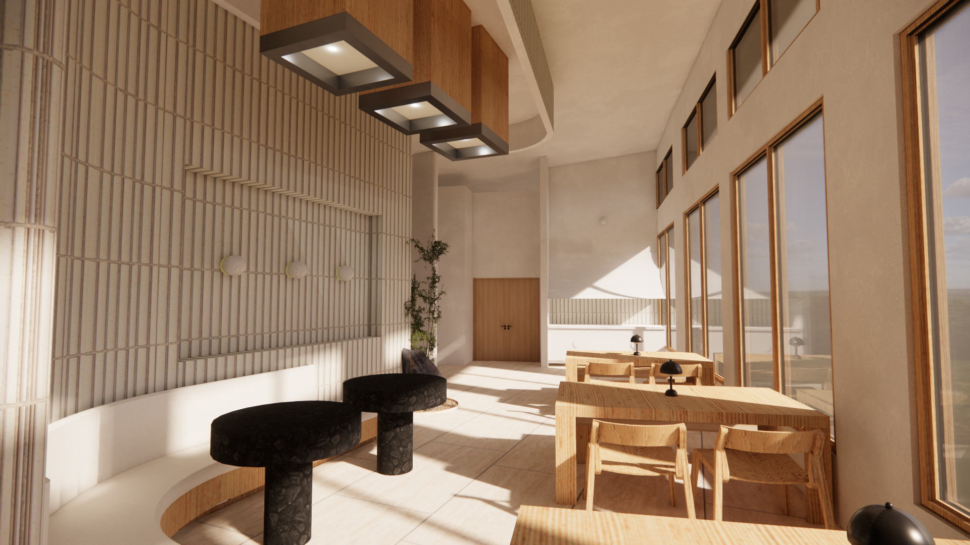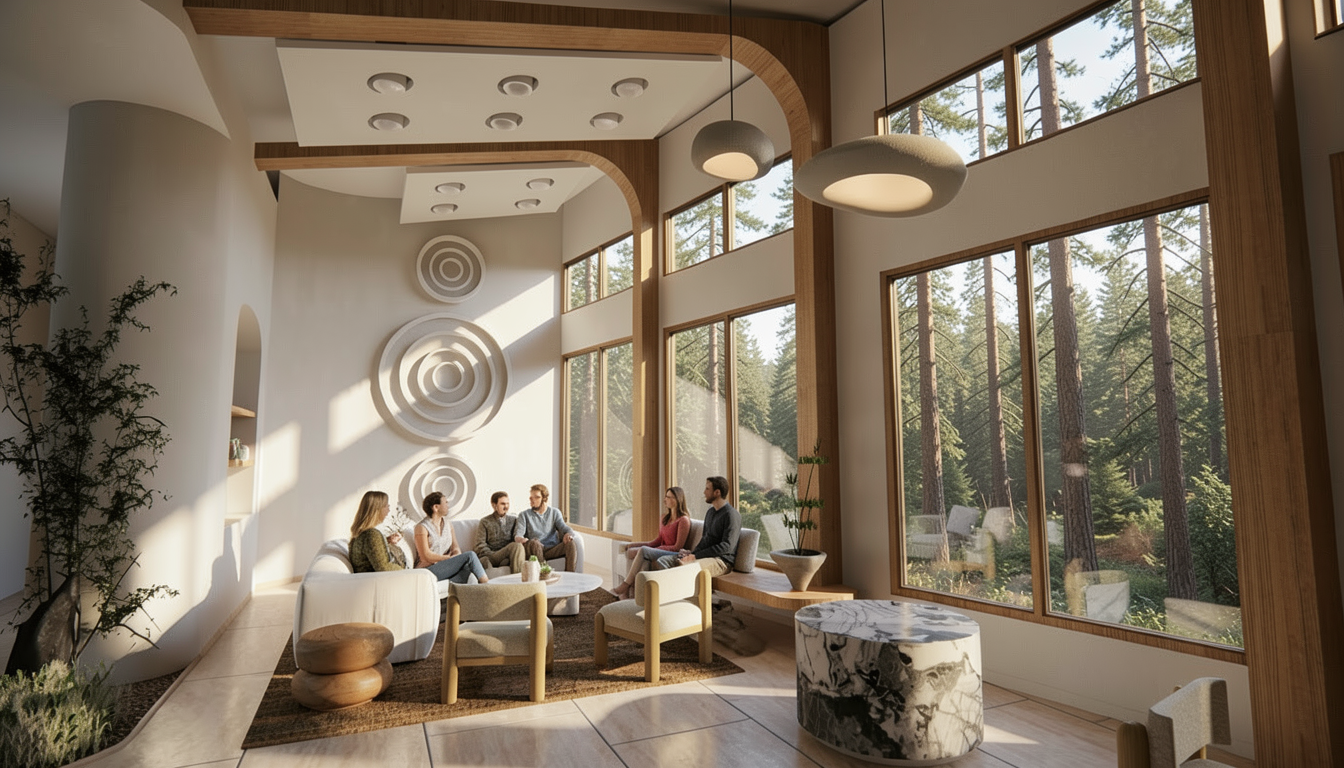 add people dining slightly warmer lighting change background to be cedar forest at second level view