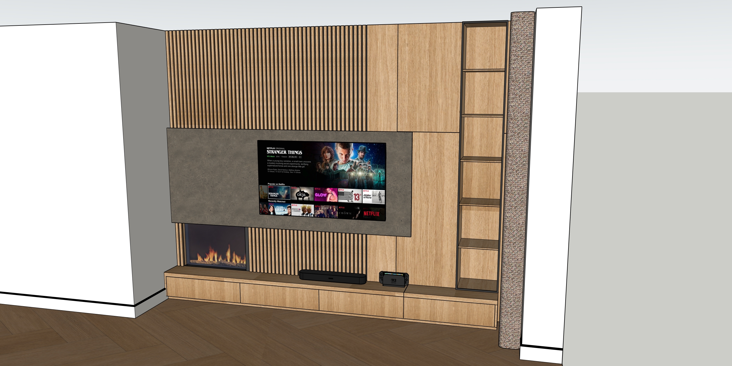 the shelves have warm lighting on the top there is also warm led lighting going all the way behind the gray panel in the middle