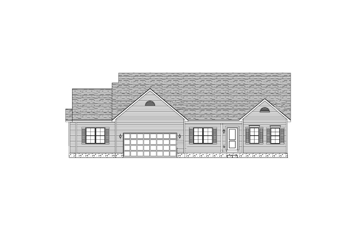 make a front elevation photorealistic as possible while keeping textures the same as shown lightly landscaped in a lightly wooded lot in oxford ohio nice lighting 3pm remove any text use the following finishes 45535c horizontal siding 45535c trim black louvered shutters white windows poured concrete foundation moire black certainteed dimensional shingles white two panel front door 8a613c post 16 panel overhead garage door in white