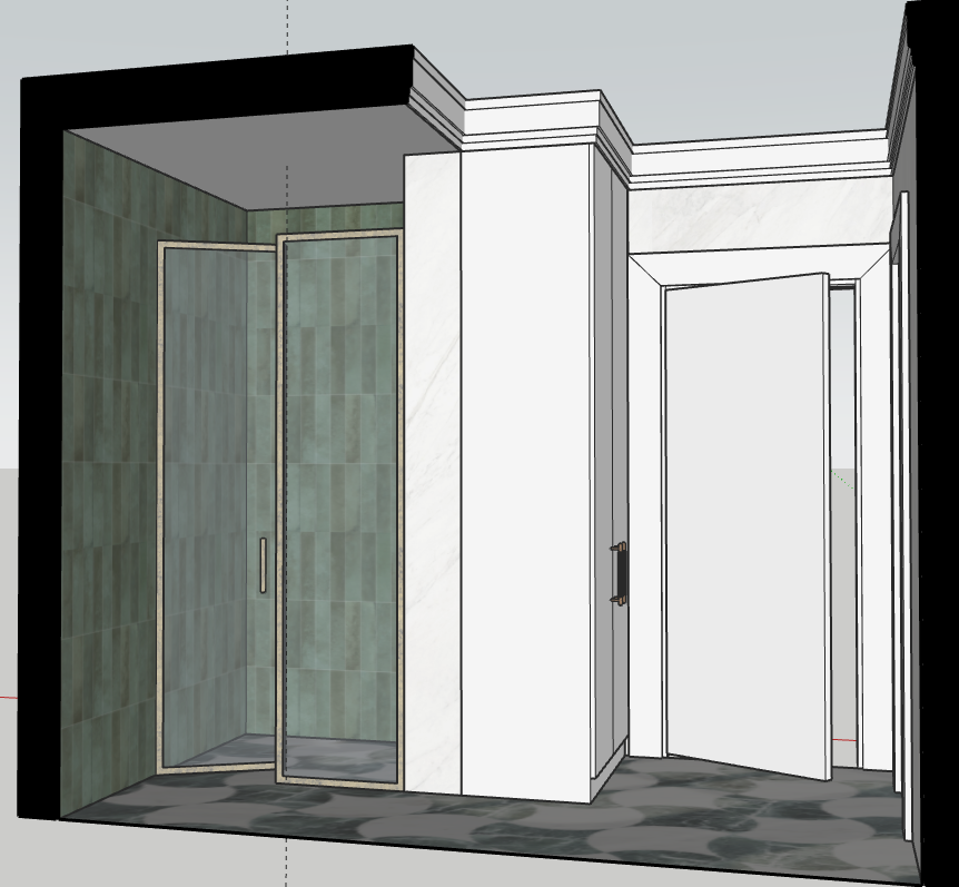 render a modern bathroom interior with an elegant soothing atmosphere the shower area features soft teal ceramic tiles with a subtle texture the glass doors have a delicate brass trim walls are a sleek matte white creating a clean and bright appearance the ceiling is white complementing the green geometric pattern of the floor tiles the open white door adds depth to the scene use soft natural lighting to enhance the calming and sophisticated ambiance all hardware and sanitaryware are made of brushed brass all furniture and doors are matt white