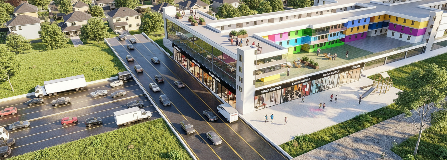a new bridge connecting two bridges existing bridges is built over an expressway the new bridge level is parking retail shops along the perimeter the second level is residential with a central courtyard and gardens the next two levels are apartments on the roof level is a deck for picnics