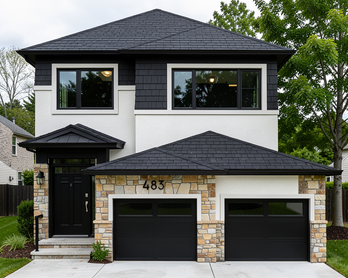 modern craftsmen style glow up with darker siding and trim and back windows timberframe gable front porch