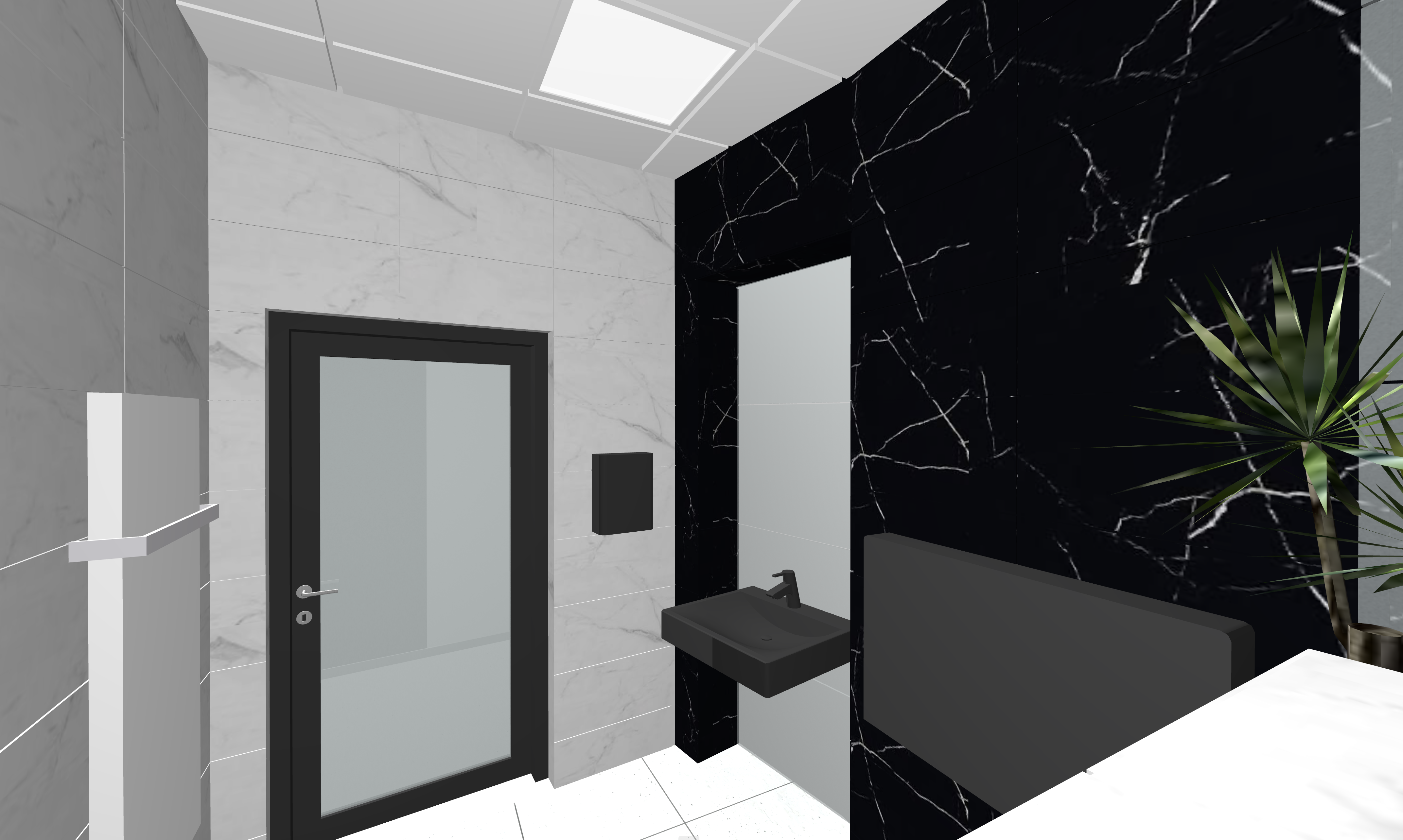 white and black carrea tiles on the walls concrete tiles on the floor bright bathroom mirror behind the black sink