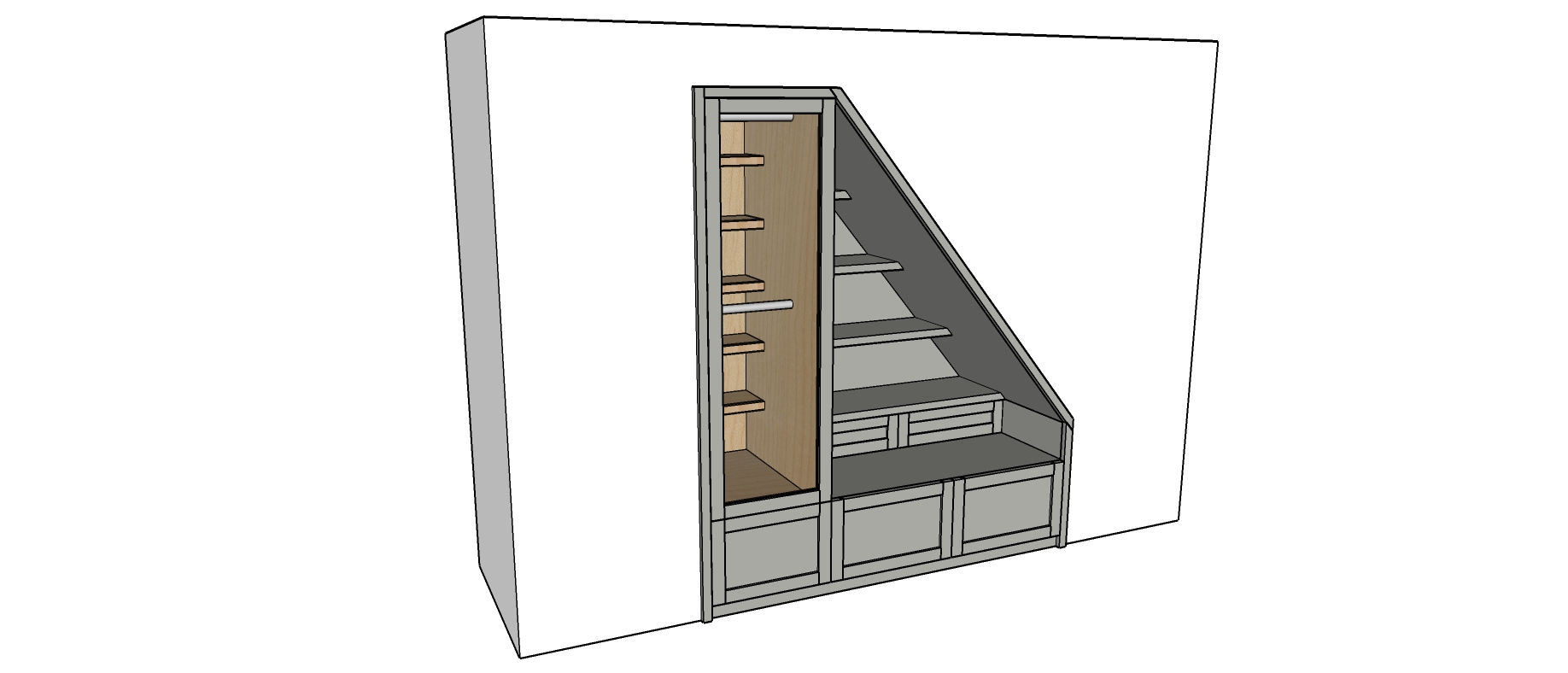 render a modern stylish shelving unit designed to fit under a staircase use a sleek light gray finish for the unit frame contrasting with rich warm maple tones for the interior shelves maple is only inside the cabinet with the glass door front everything else is the gray there should be two hangin rods in the glass front cabinet one about halfway up and the other near the top the builtin should extend 1 proud of the surrounding wall the atmosphere should be cozy and inviting as if in a contemporary living room highlight the geometric lines of the design emphasizing the slanted structure and ensure the overall ambiance is clean and minimalist