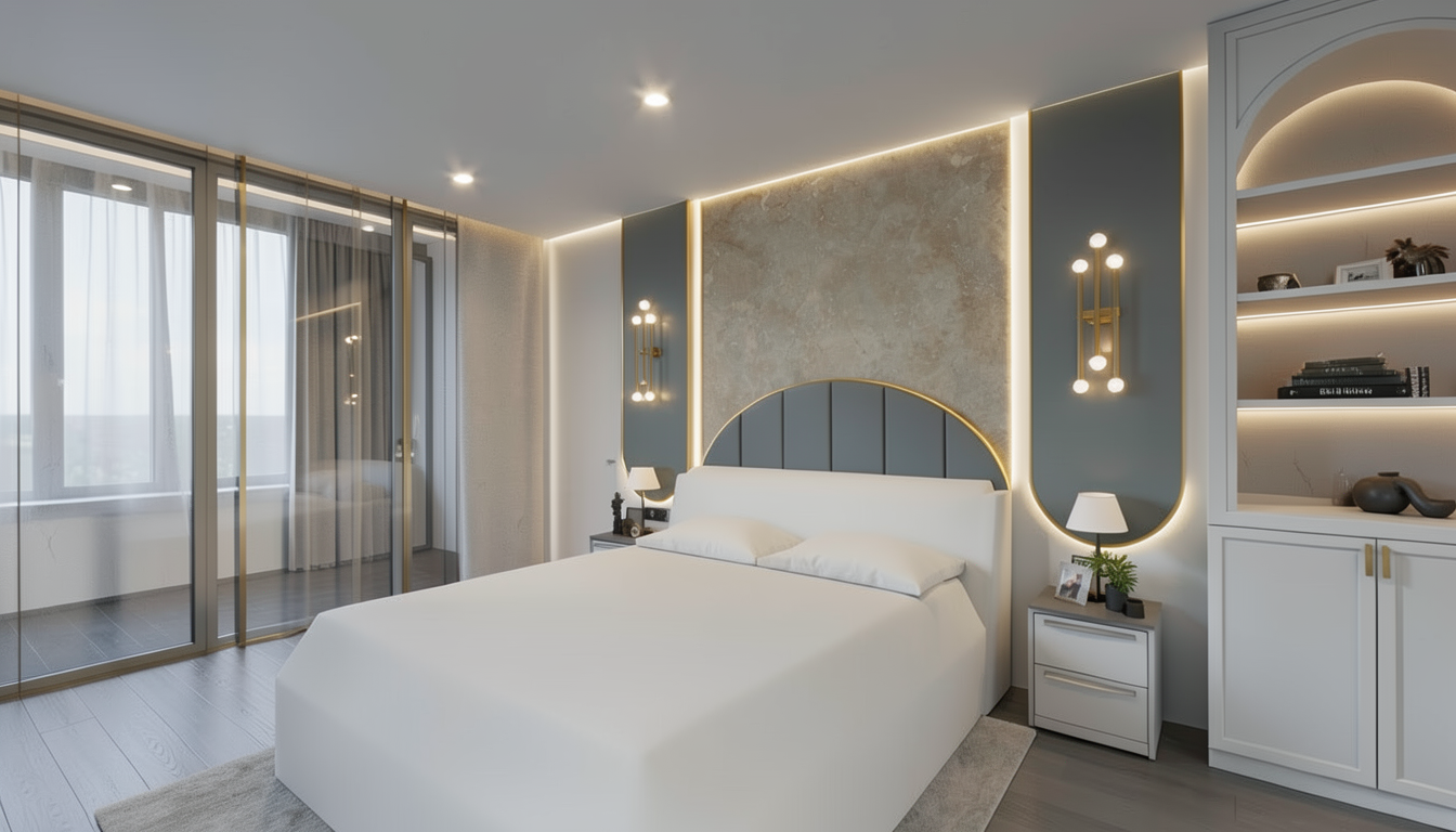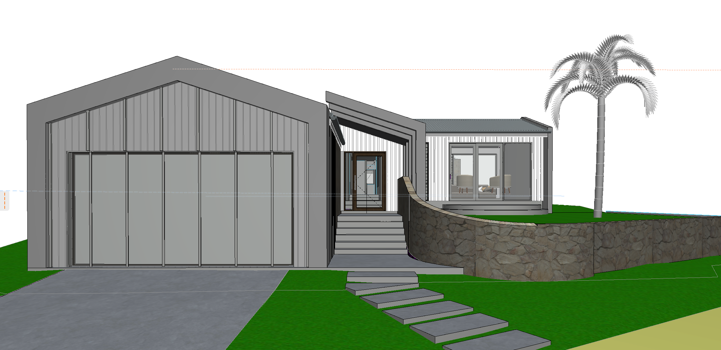 transform this archicad screenshot of the front of a house into a high res render show a large palm tree in the front yard the house is a costal theme with white vertical cladding and formed concrete the roof is surfmist colour