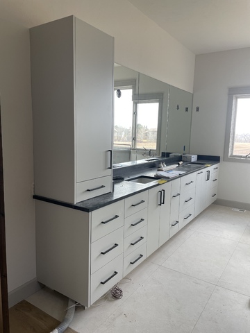 do not change the cabinets in any way preserve the exact cabinet colors materials finishes dimensions door and drawer styles hardware spacing alignment and all geometry exactly as shown do not alter the countertop shape backsplash appliances flooring lighting fixtures or wall structure only remove the construction materials clutter and mess from the scene clean the room and make it look finished and staged add a few simple tasteful home accessories appropriate for the style of the space but do not add or remove any furniture windows or architectural elements maintain the original lighting direction and realism enhance clarity and polish the photo while keeping the cabinetry and room design completely unchanged do not alter the lighting to keep the cabinet colors as they are in the image add a simple view out the window add vanity lights over the mirror add faucets to the sinks add rugs in front of the sink cabinets add flat crown molding to the tower cabinet