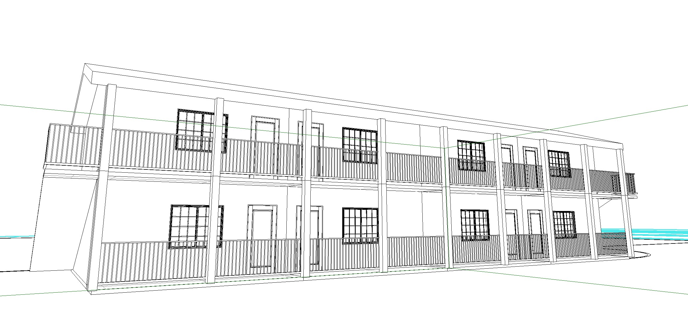 contemporary exterior shot render image showing asphalt paving at front and trees in the back of the building with contemporary stucco and black steel posts and railings architecture