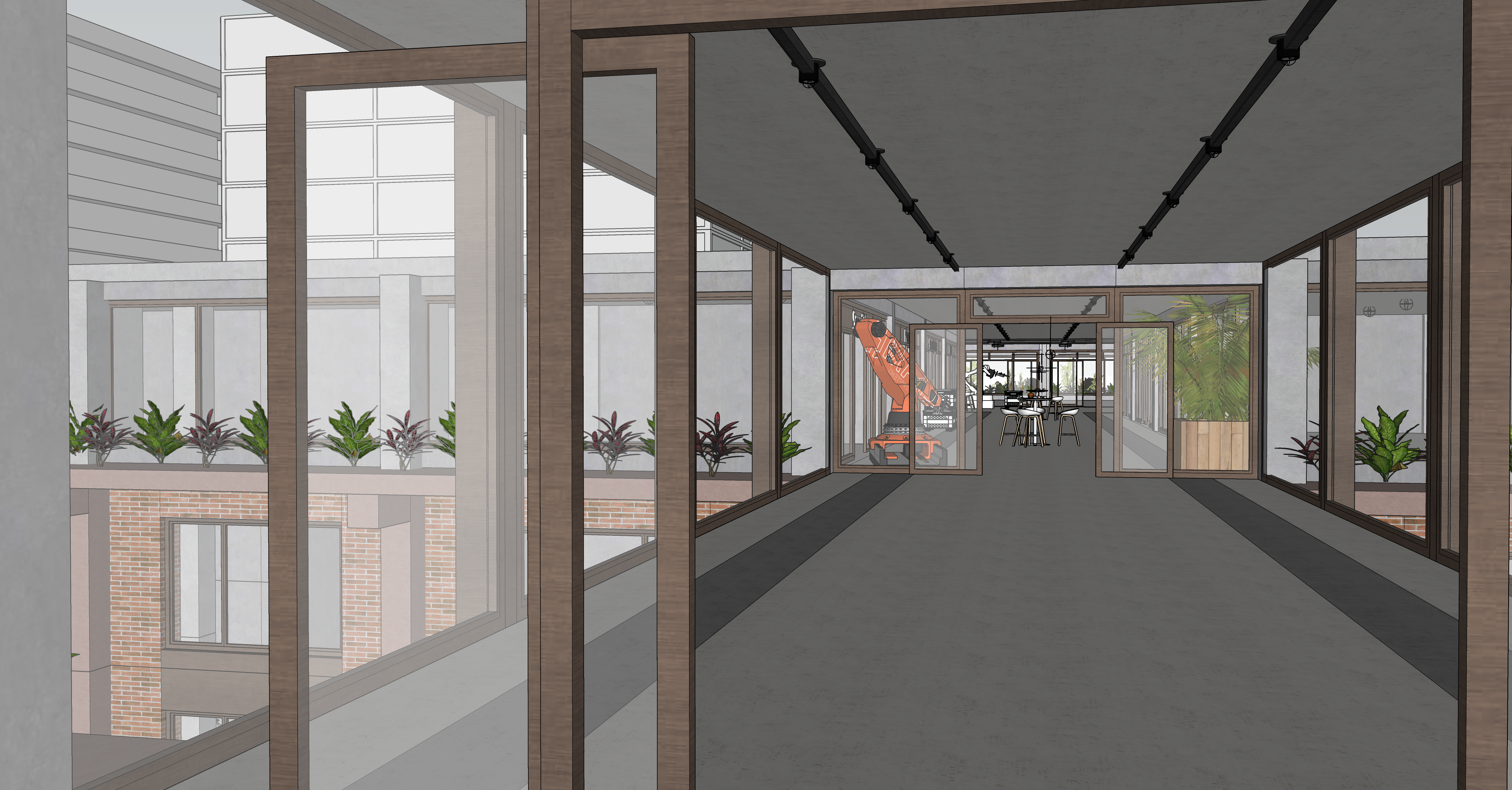 modernist interior shot industrial coworking space lush green wooden details architecture