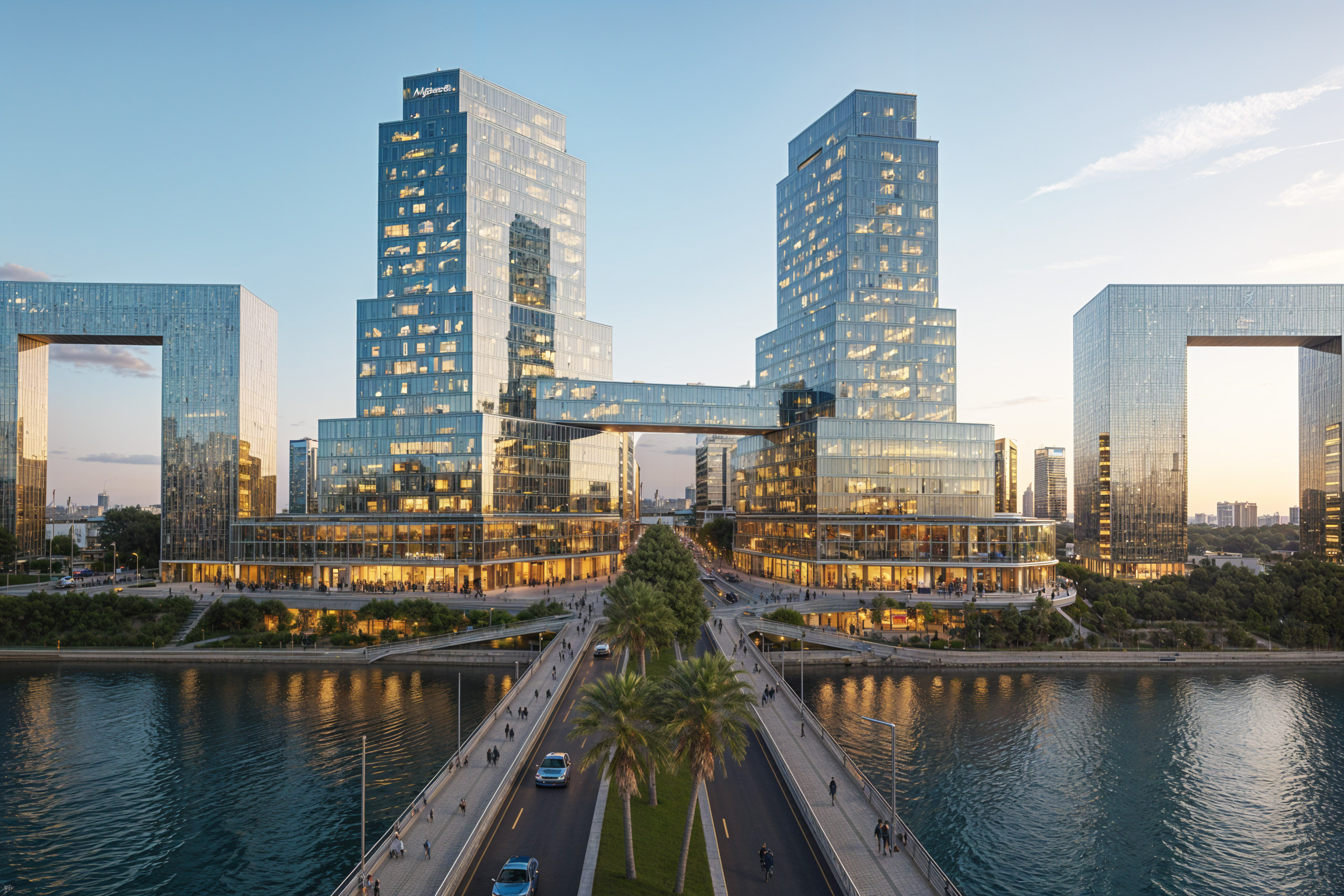 keep everything exactly as it is in the input image preserving the original morphology scale volumetry and atmosphere on the bridge connecting the two buildings suggest the presence of a restaurant with warm lighting and some vegetation there should be active life on the ground floor and orange toned warm lights should be visible inside along the base plinth of each building add hanging vegetation cascading downward
